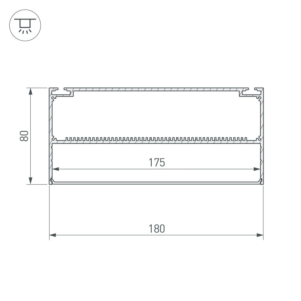 Комплект с экраном. Алюминиевый анодированный подвесной профиль для светодиодных лент и линеек, с отсеком для блока питания (высота отсека 40 мм). Габаритные размеры (L×W×H): 2000x180x80 мм. Ширина площадки для ленты 175 мм. Аксессуары приобретаются отдельно. Цена за комплект: профиль — 2 м, экран — 2 м.