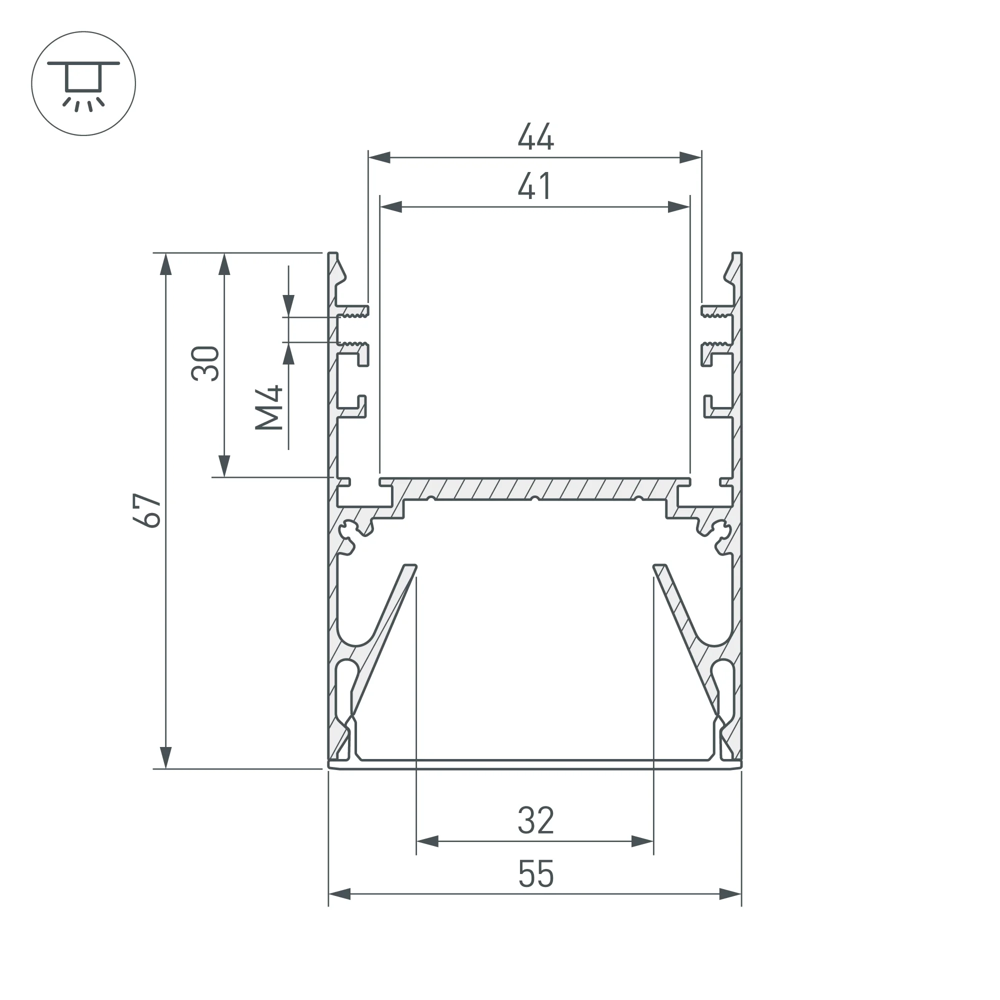 Комплект с экраном. Алюминиевый анодированный профиль для светодиодных лент и линеек, с отсеком для блока питания. Размер отсека 29х44мм. Габаритные размеры (L×W×H): 2000x55x67,4 мм. Ширина площадки для ленты 32,3 мм. Аксессуары приобретаются отдельно. Цена за комплект: профиль — 2 м, экран — 2 м.