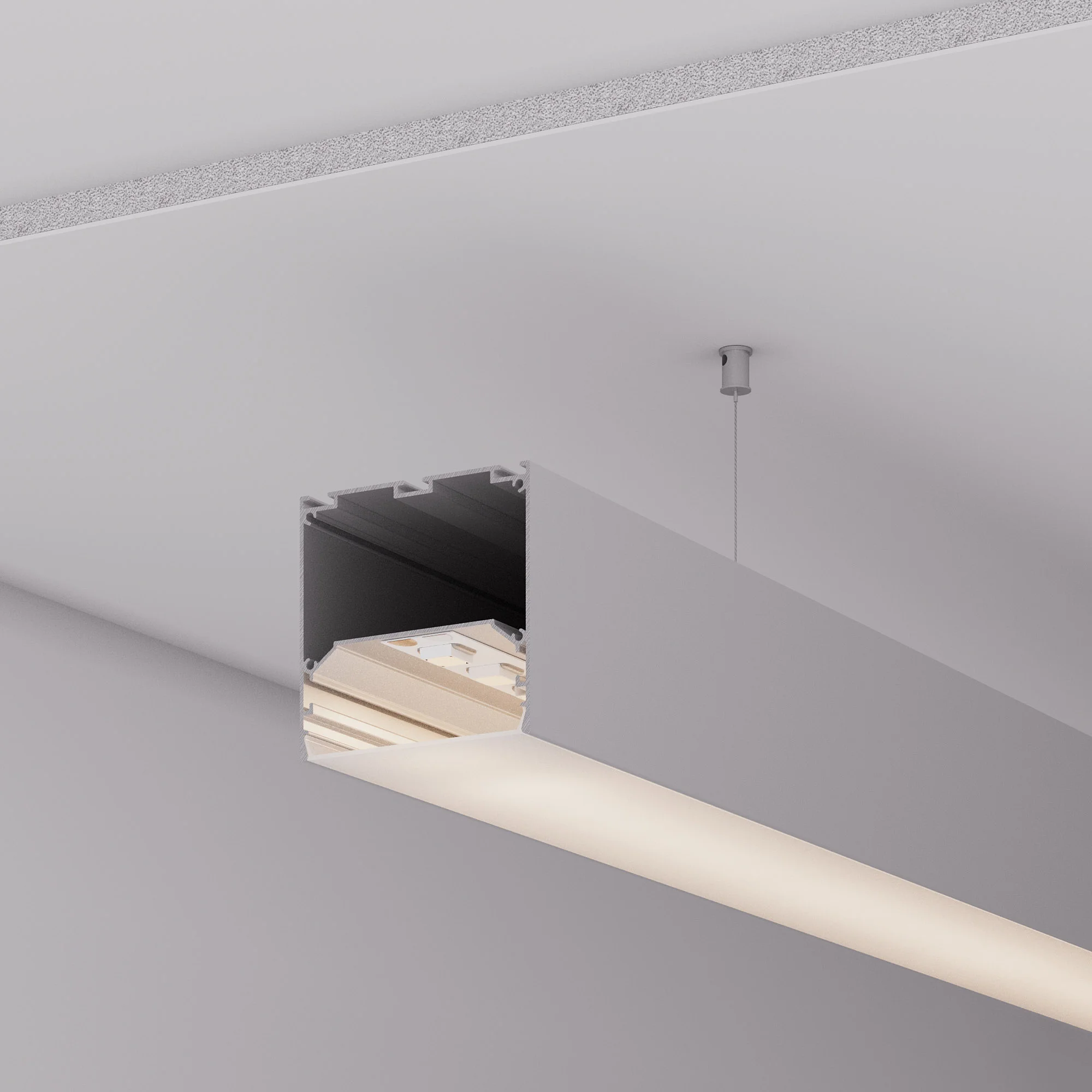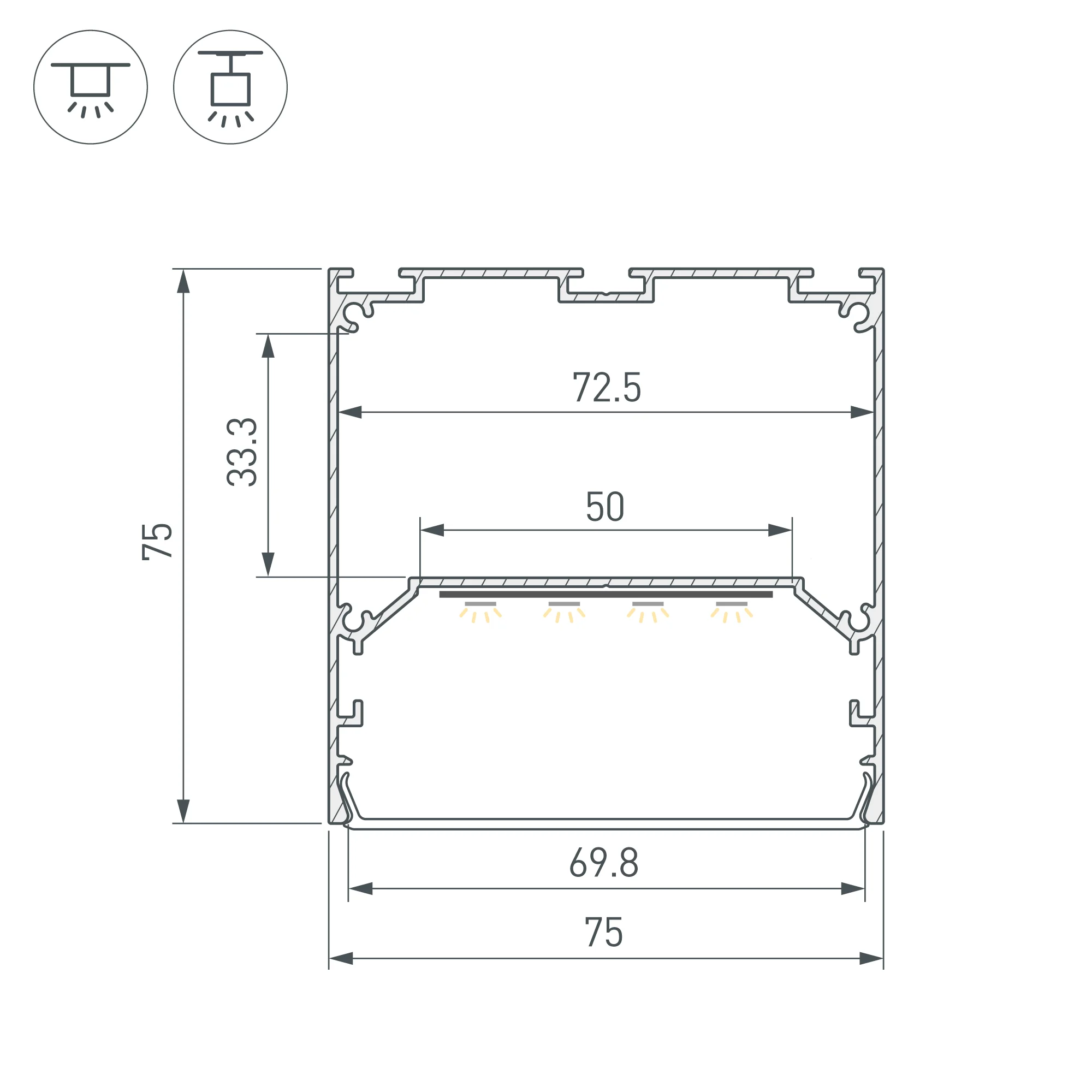 Алюминиевый анодированный профиль для светодиодных лент и линеек. Габаритные размеры (L×W×H): 2000x75x75 мм. Ширина площадки для ленты 50 мм. Отсек для БП 72,5х33,3 мм. Экраны, заглушки и другие аксессуары приобретаются отдельно. Цена за 1 метр. Кратность заказа поставщику: 2 м.