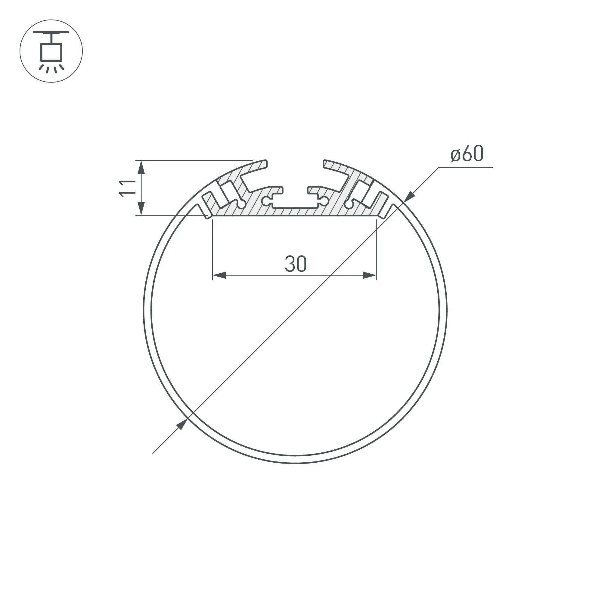 Комплект с экраном. Алюминиевый анодированный профиль для светодиодных лент и линеек. Габаритные размеры профиля (L×W×H): 2500x34x11 м. Габаритные размеры профиля с экраном (L×D): 2500xD60 мм. Ширина площадки для ленты 30 мм. Аксессуары приобретаются отдельно. Цена за комплект: профиль — 2,5 м, экран — 2,5 м.