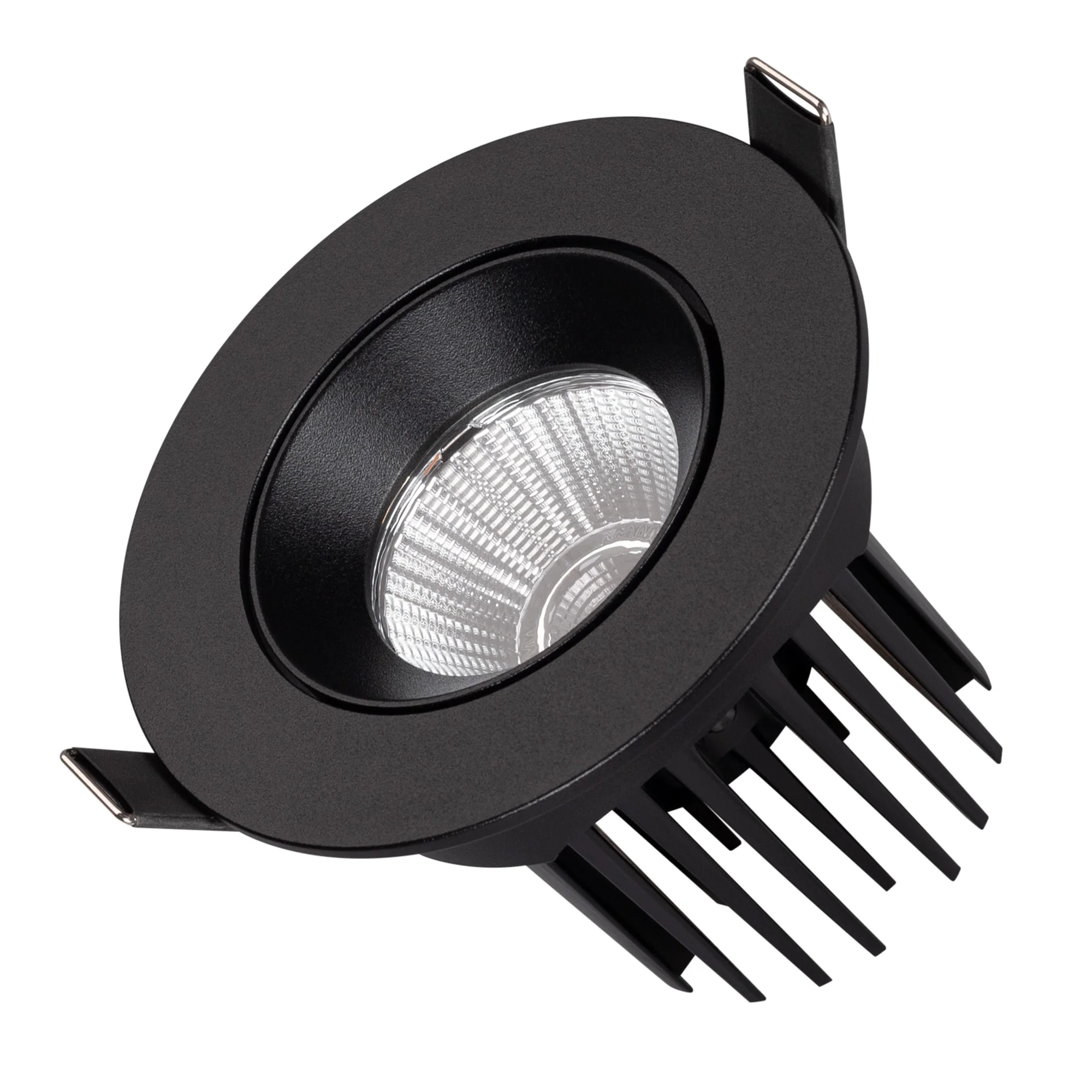 Встраиваемый светильник даунлайт. Мощность 10 Вт, св. поток 880 лм, 88 лм/Вт, дневной 4000 K, CRI>90, угол 36°, напряжение питания 230 В. Черный круглый корпус из алюминия, экран PMMA, степень защиты IP54. Размер: диаметр 86 мм, высота 80 мм. Монтаж встраиваемый, установочное отверстие: диаметр 75 мм. Драйвер IP54, 20-40 В, 250 мА, пульсация <1%.