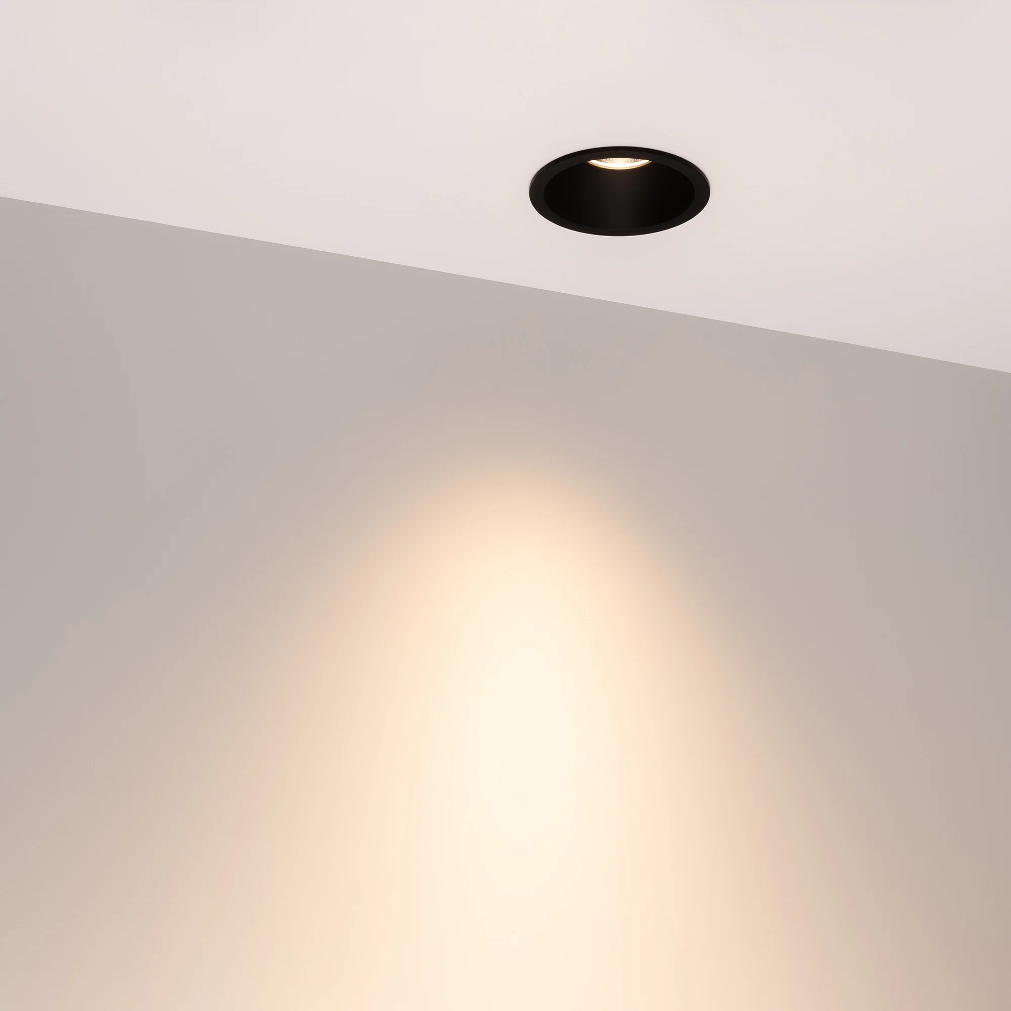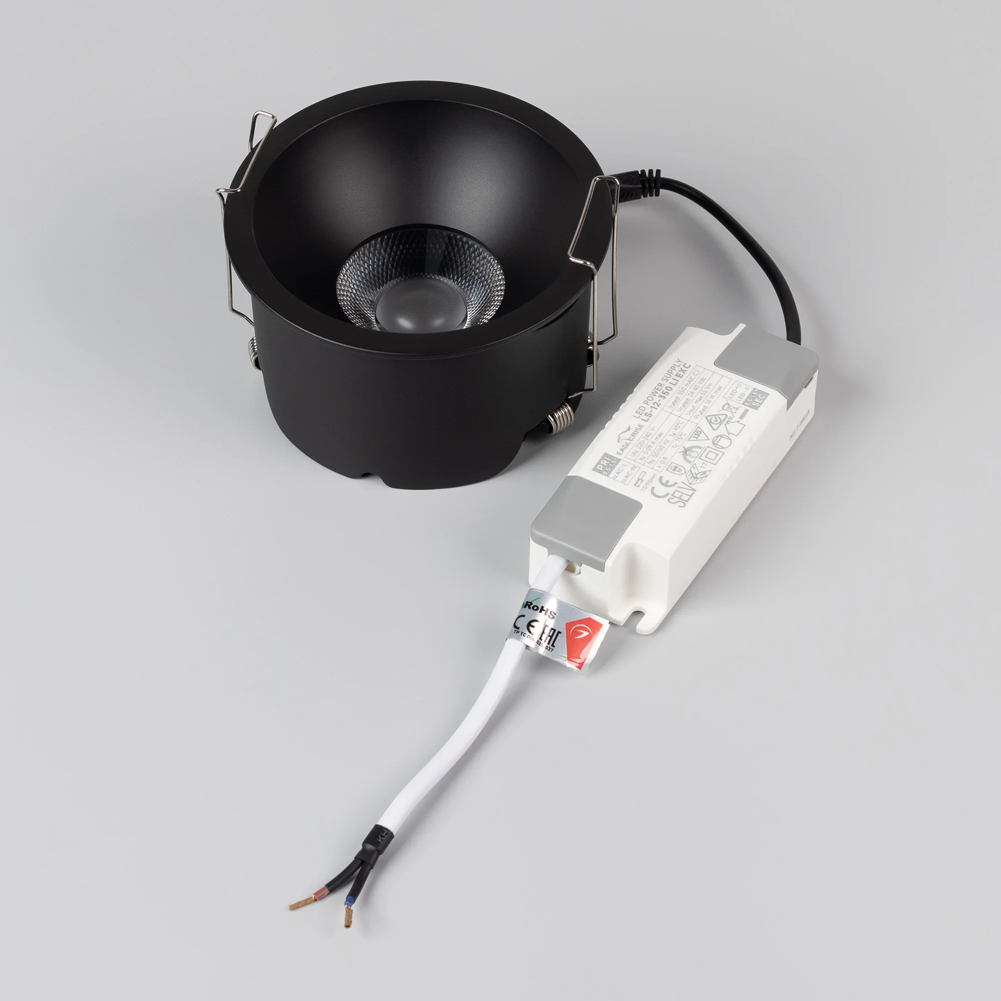 Встраиваемый светильник даунлайт. Мощность 10 Вт, св. поток 980 лм, 98 лм/Вт, тёплый 3000 K, CRI>90, угол 36°, напряжение питания 230 В. Чёрный круглый корпус из алюминия, степень защиты IP20. Размер: диаметр 82 мм, высота 53 мм. Монтаж встраиваемый, установочное отверстие: диаметр 75 мм. UGR<14. Драйвер 30-42 В, 250 мА, пульсация <2%.