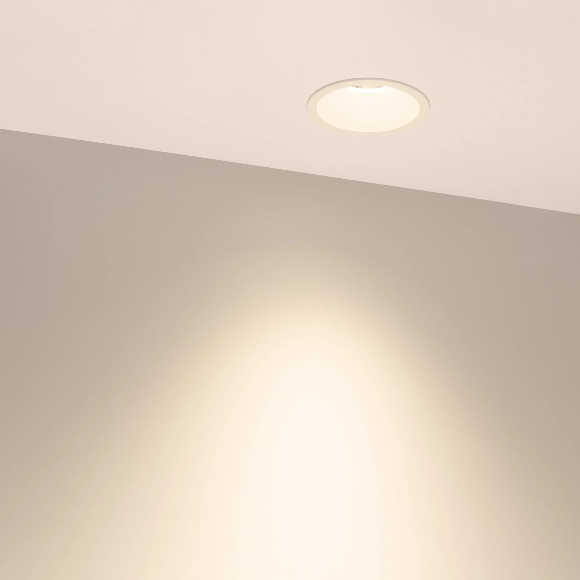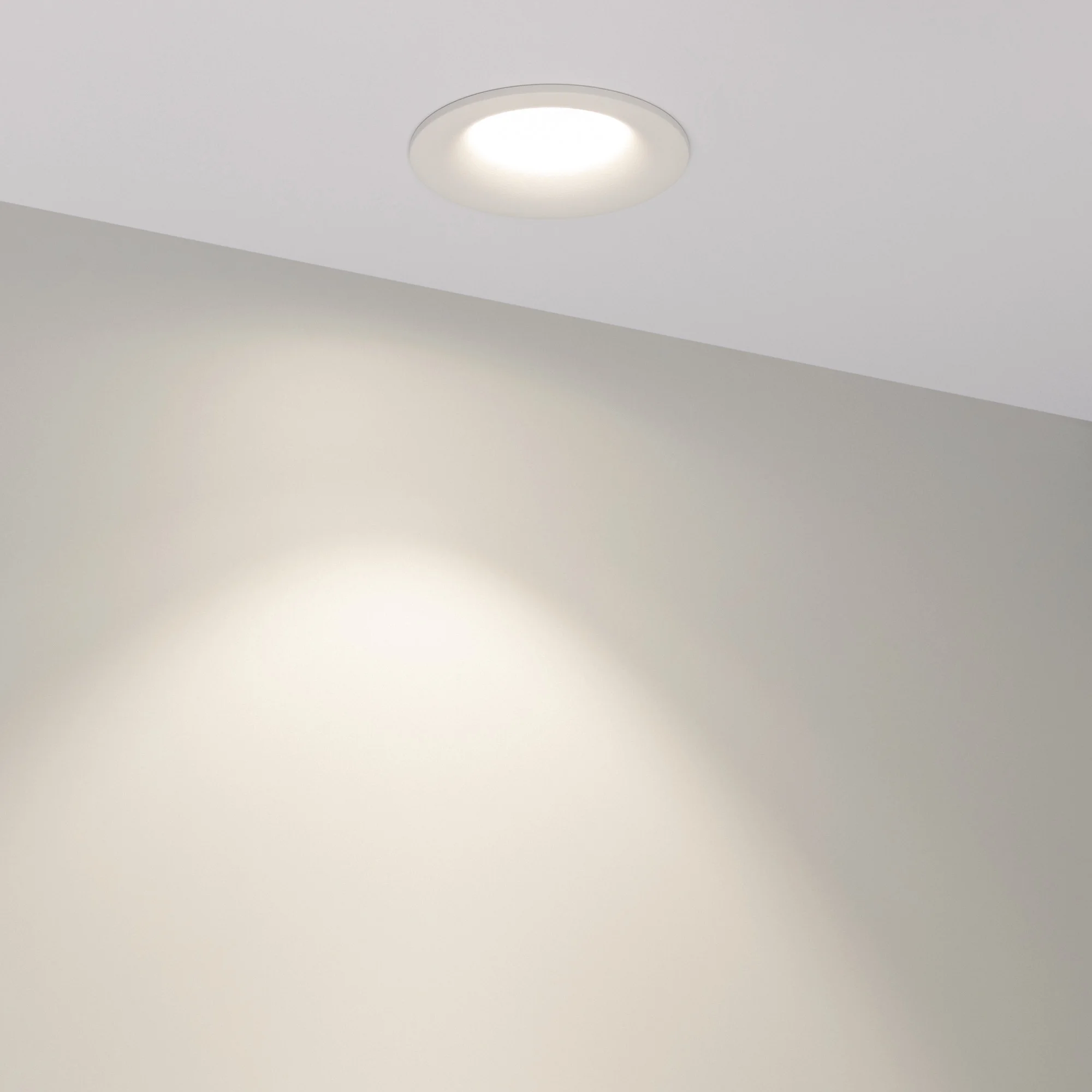 Встраиваемый поворотный светильник «даунлайт». Мощность 4.5 Вт, св. поток 400 лм, 89 лм/Вт, дневной 4000 K, CRI>80, UGR<19, угол 36°, напряжение питания 230 В. Белый круглый корпус из теплопроводящего полиамида, экран пластик, степень защиты IP20, угол поворота оси 30°. Размер: диаметр 80 мм, высота 37.5 мм. Монтаж встраиваемый, установочное отверстие диаметр 60-70 мм. Пульсация <2%.