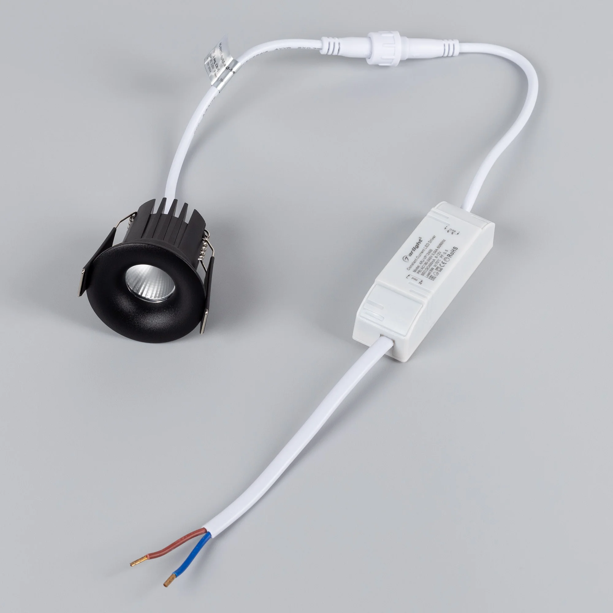 Встраиваемый светильник даунлайт. Мощность 5 Вт, св. поток 400 лм, 80 лм/Вт, тёплый 3000 K, CRI>90, угол 36°, напряжение питания 230 В. Черный круглый корпус из алюминия, экран PMMA, степень защиты IP54. Размер: диаметр 45 мм, высота 43 мм. Монтаж встраиваемый, установочное отверстие: диаметр 35 мм. Драйвер IP54, 8-12 В, 400 мА, пульсация <1%.