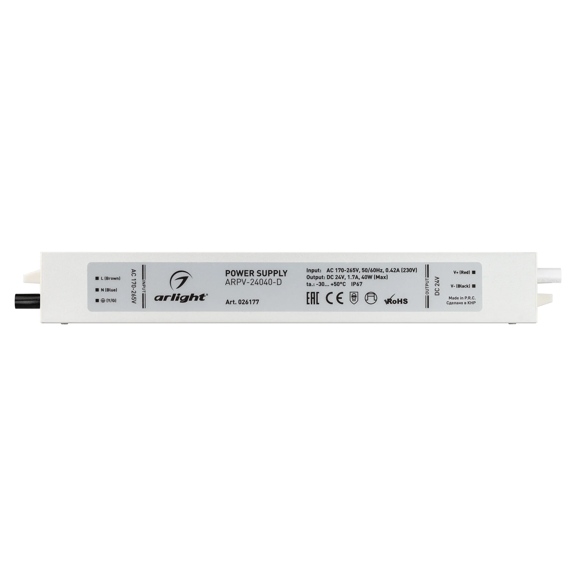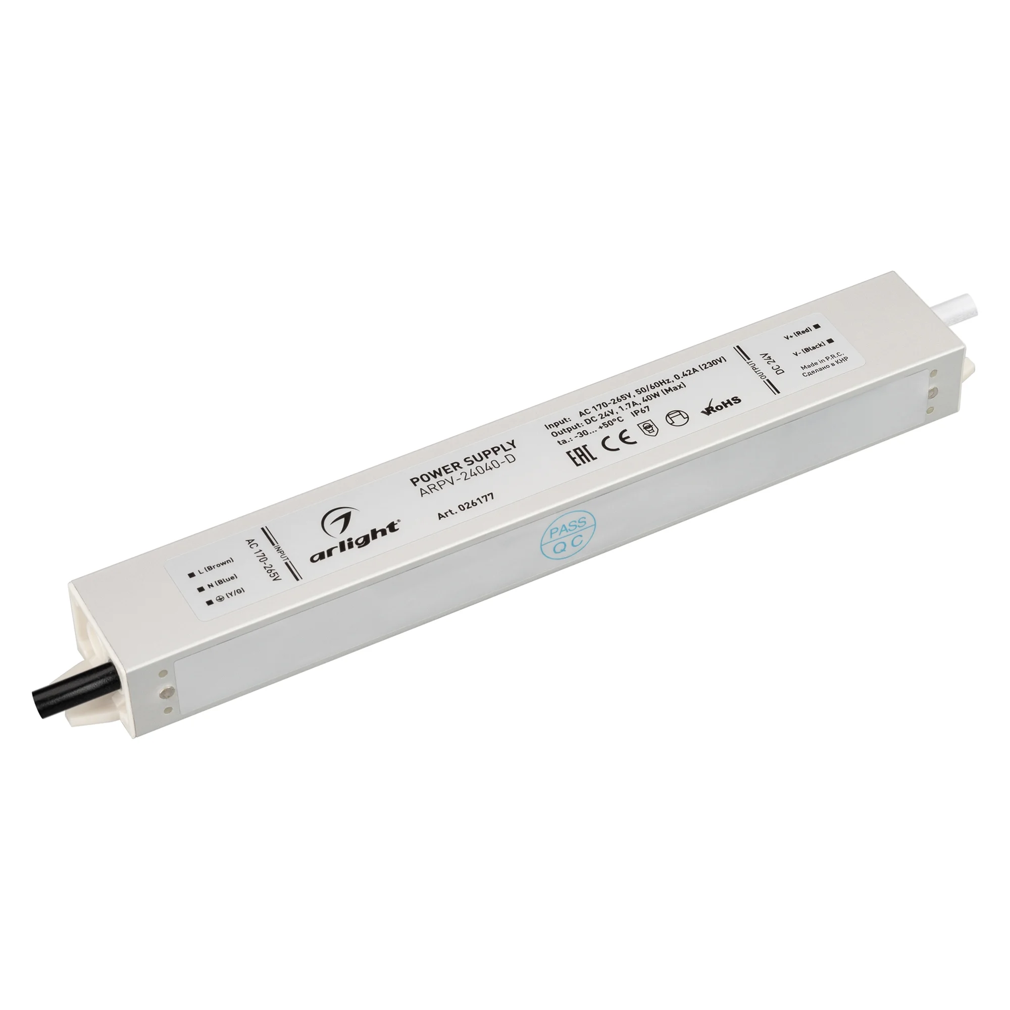 Источник напряжения с гальванической развязкой для светодиодных изделий. Входное напряжение 170-265 VAC. Выходные параметры: 24 В, 1,7 А, 40 Вт. Встроенный PFC >0,5. Герметичный алюминиевый корпус IP 67. Рабочая температура -30…+50C°. Габаритные размеры длина 217 мм, ширина 30 мм, высота 20 мм. Гарантийный срок 3 года.