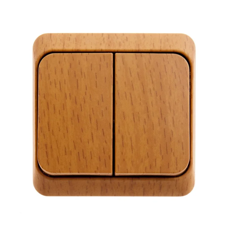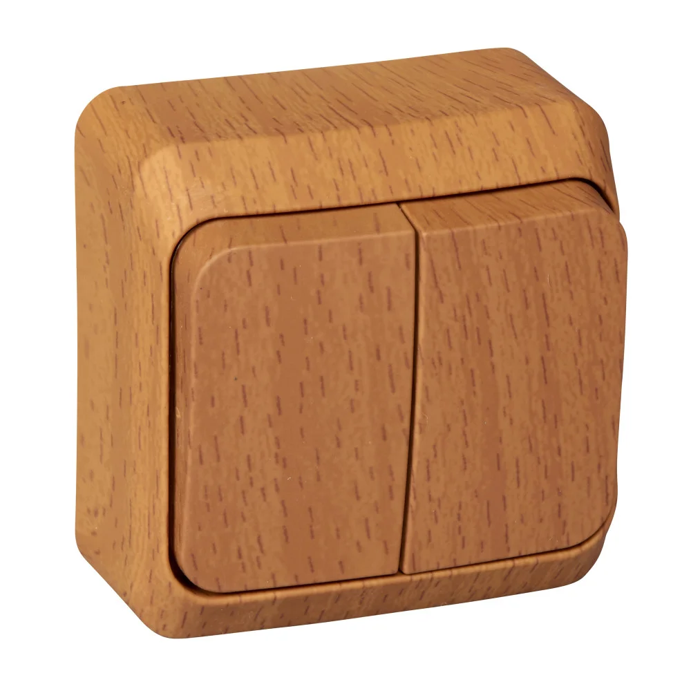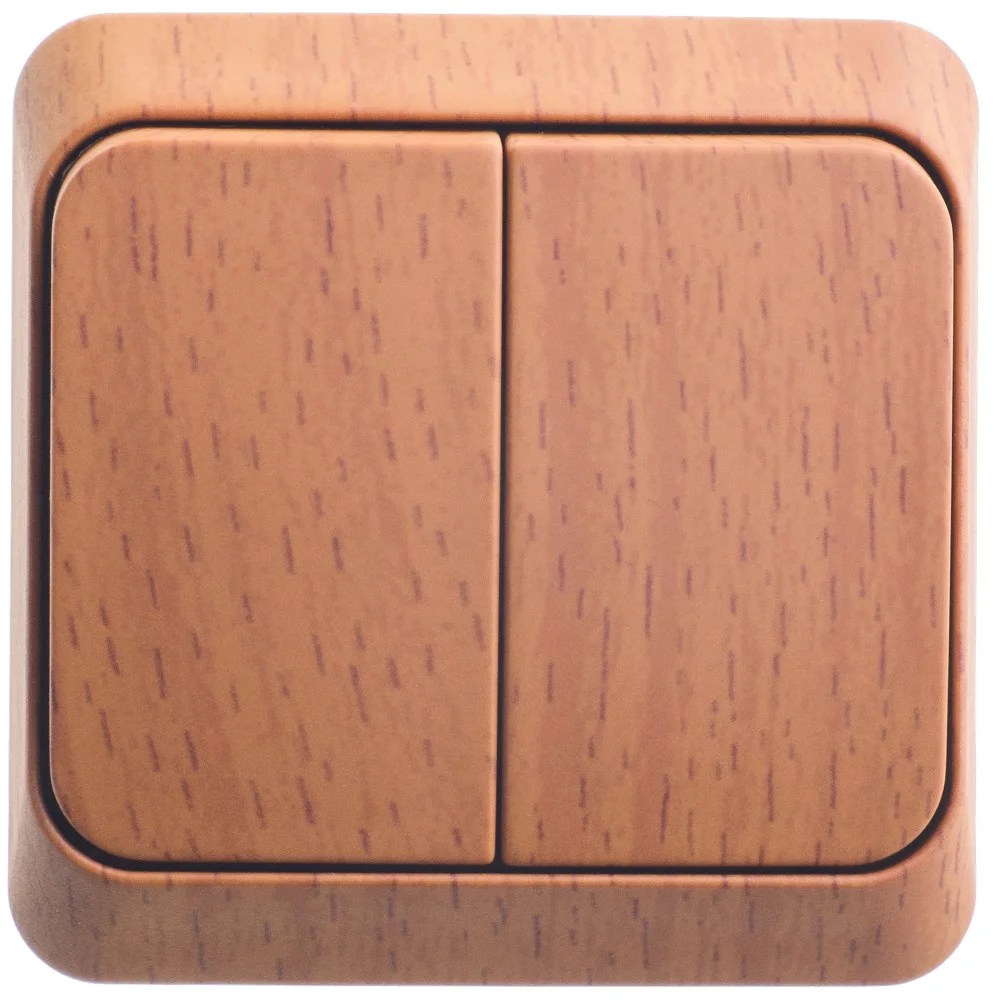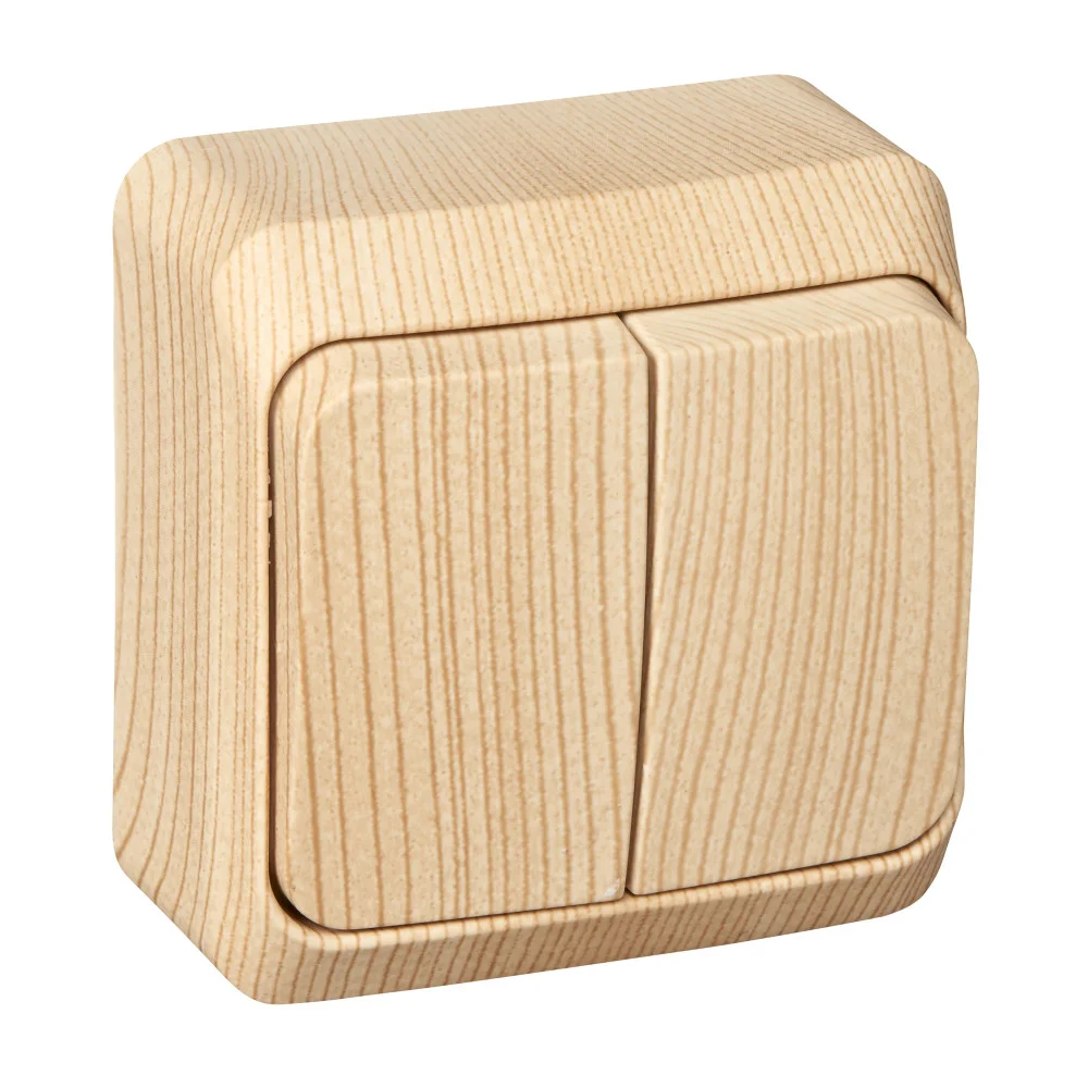 Выключатель Systeme Electric (ранее Schneider Electric) ЭТЮД (бук, открытой установки) двухклавишный предназначен для применения в сетях до 250В, на ток до 10А. Две клавиши позволяют управлять двумя источниками света с одной точки. Изделия цвета Бук обладают уникальным рисунком, напоминающим древесный сруб. Он прост в установке и удобен применении. Сделано в России.