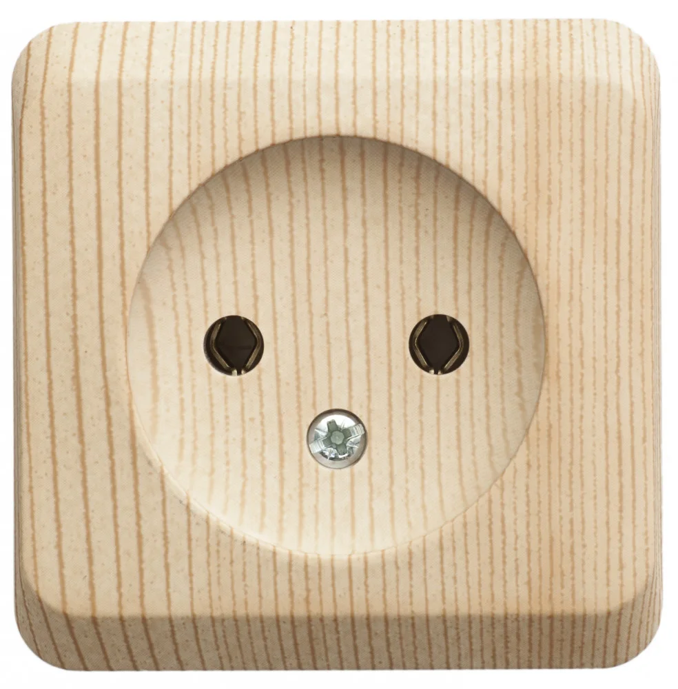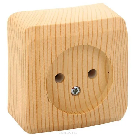 Розетка Systeme Electric (ранее Schneider Electric) ЭТЮД (сосна, открытой установки) одноместная предназначена для применения в сетях до 250В, на ток до 16А, без шторок и заземления. Она проста в установке и удобна в применении, идеально подходит для загородного дома. Изделия цвета Сосна обладают уникальным рисунком, напоминающим древесный сруб. Сделано в России.