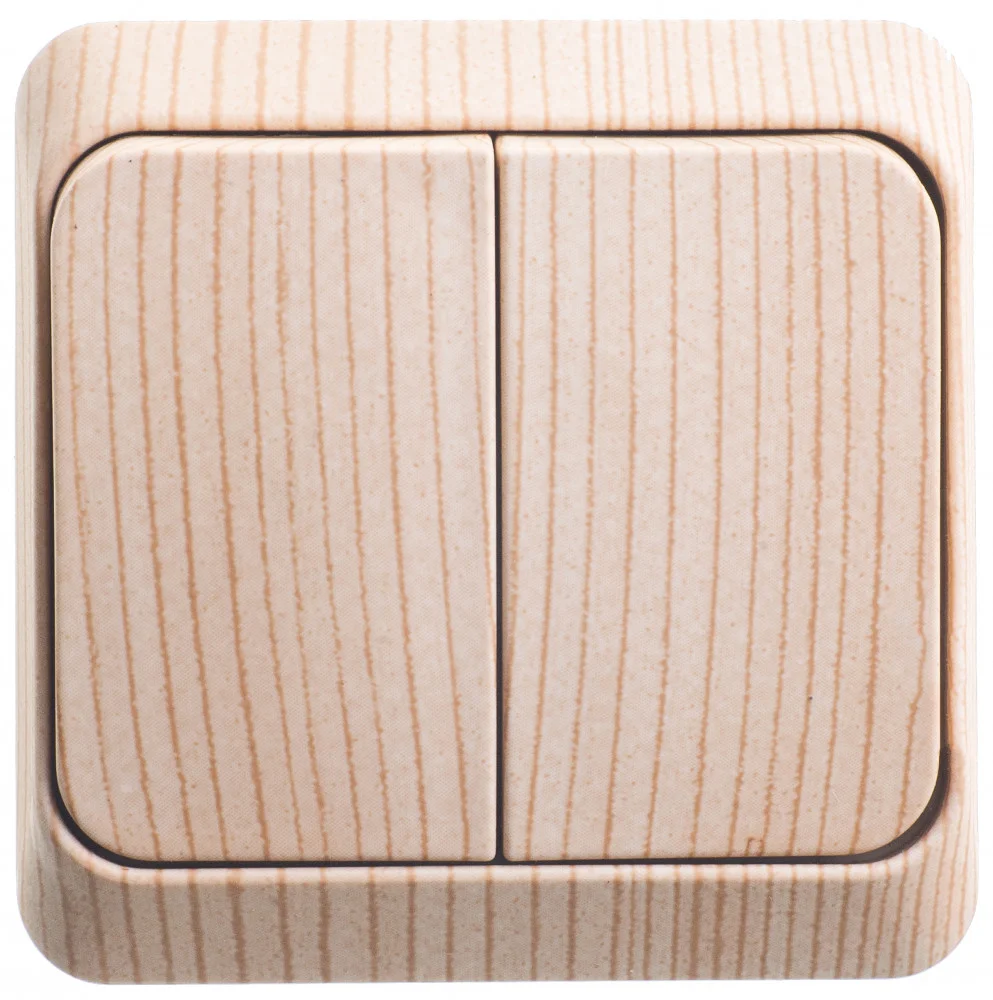 Выключатель Systeme Electric (ранее Schneider Electric) ЭТЮД (сосна, открытой установки) двухклавишный предназначен для применения в сетях до 250В, на ток до 10А. Две клавиши позволяют управлять двумя источниками света с одной точки. Изделия цвета Сосна обладают уникальным рисунком, напоминающим древесный сруб. Он прост в установке и удобен применении. Сделано в России.