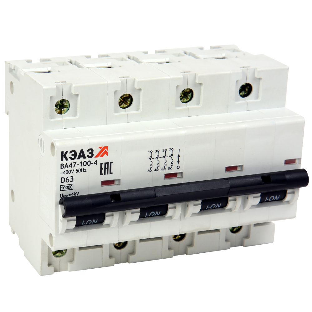 Модульный автоматический 4 полюсный выключатель переменного тока с предельной коммутационной способностью при переменном токе 10 кА на номинальный ток 80 А .