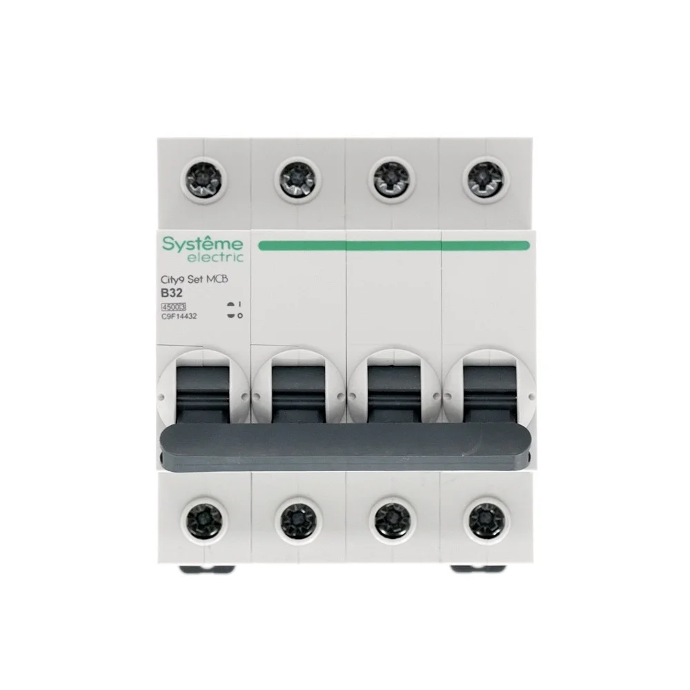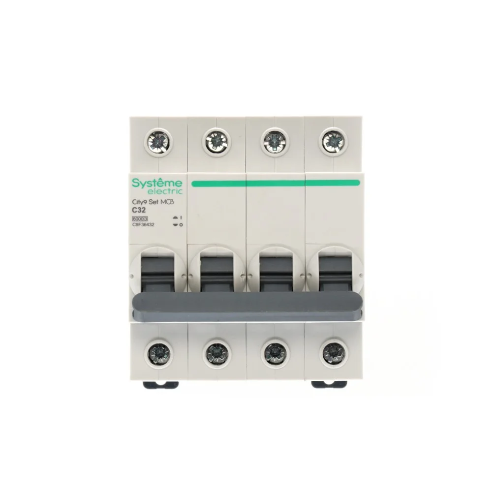 Автоматический выключатель серии City9 Set Systeme Electric, 4-полюсный, номинальный ток 32 А, характеристика С, Icn = 6 кА. Применяется в электрических сетях напряжением 400 В. Предназначен для защиты от перегрузок и токов короткого замыкания. Оснащен механизмом «мгновенной коммутации». Ударопрочный корпус из специального пластика с 6 металлическими заклепками. Безопасные клеммы исключают попадание кабелей в заклеммное пространство.