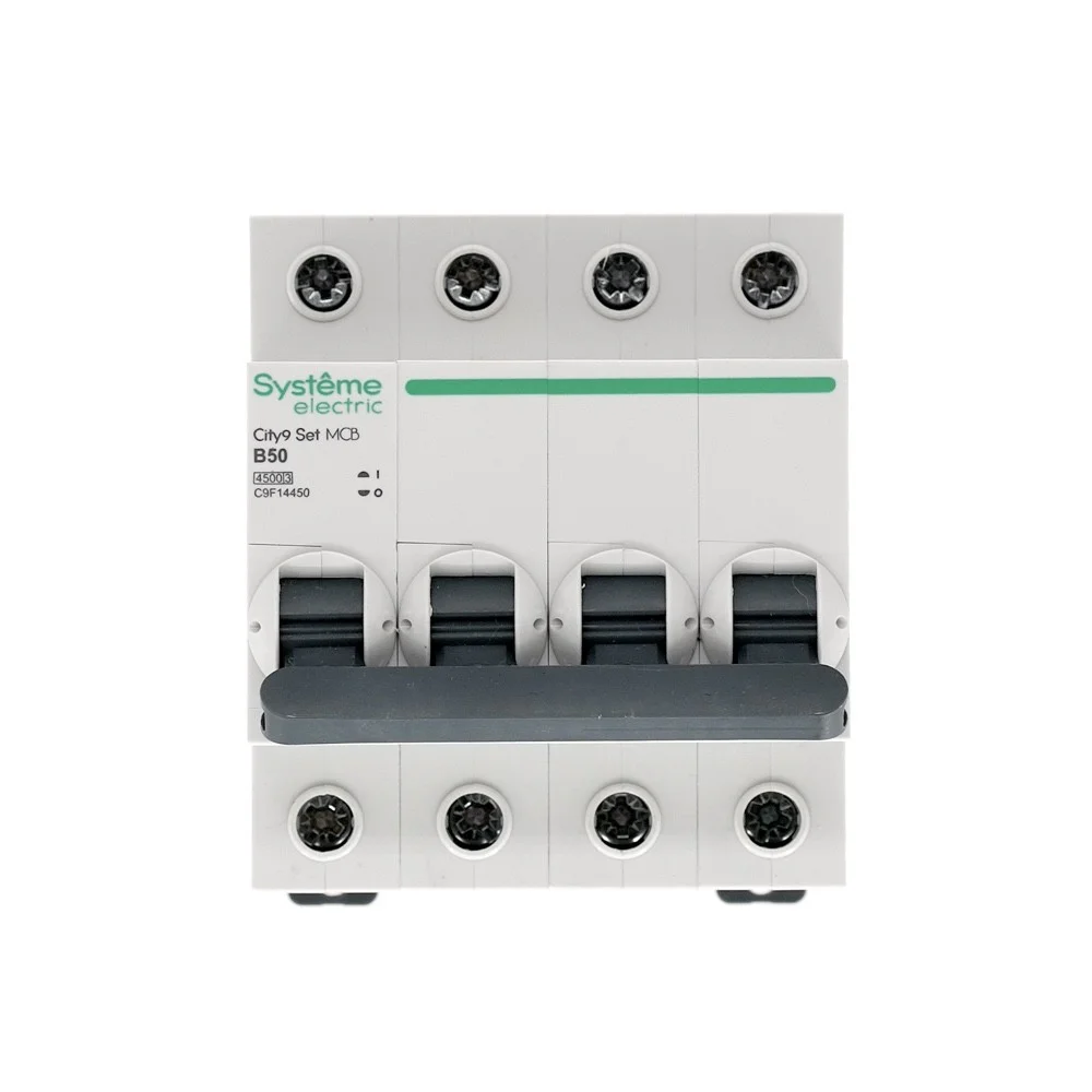 Автоматический выключатель серии City9 Set Systeme Electric, 4-полюсный, номинальный ток 50 А, характеристика С, Icn = 6 кА. Применяется в электрических сетях напряжением 400 В. Предназначен для защиты от перегрузок и токов короткого замыкания. Оснащен механизмом «мгновенной коммутации». Ударопрочный корпус из специального пластика с 6 металлическими заклепками. Безопасные клеммы исключают попадание кабелей в заклеммное пространство.