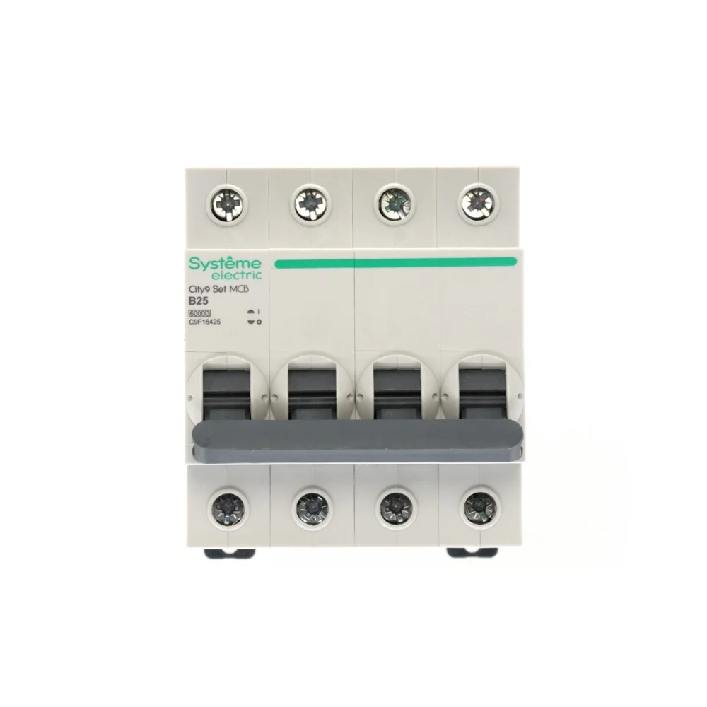Автоматический выключатель серии City9 Set Systeme Electric, 4-полюсный, номинальный ток 25 А, характеристика B, Icn = 6 кА. Применяется в электрических сетях напряжением 400 В. Предназначен для защиты от перегрузок и токов короткого замыкания. Оснащен механизмом «мгновенной коммутации». Ударопрочный корпус из специального пластика с 6 металлическими заклепками. Безопасные клеммы исключают попадание кабелей в заклеммное пространство.