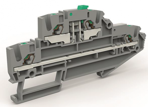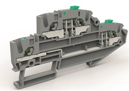 DKC Nuputuk Клемма двухуровневая, зажим push-in, 4 точки подключения, уровни соединены перемычкой, 2.5 кв.мм, серая
