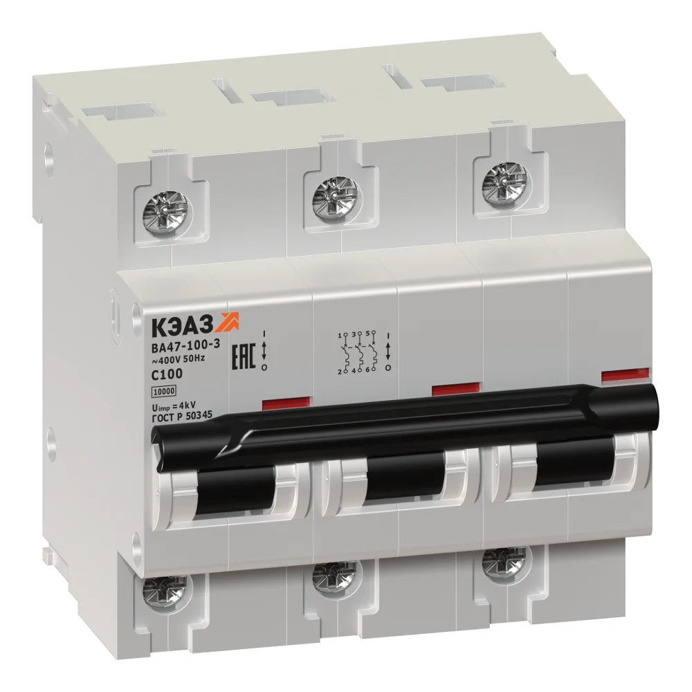 Модульный автоматический 3 полюсный выключатель переменного тока с предельной коммутационной способностью при переменном токе 10 кА на номинальный ток 50 А .