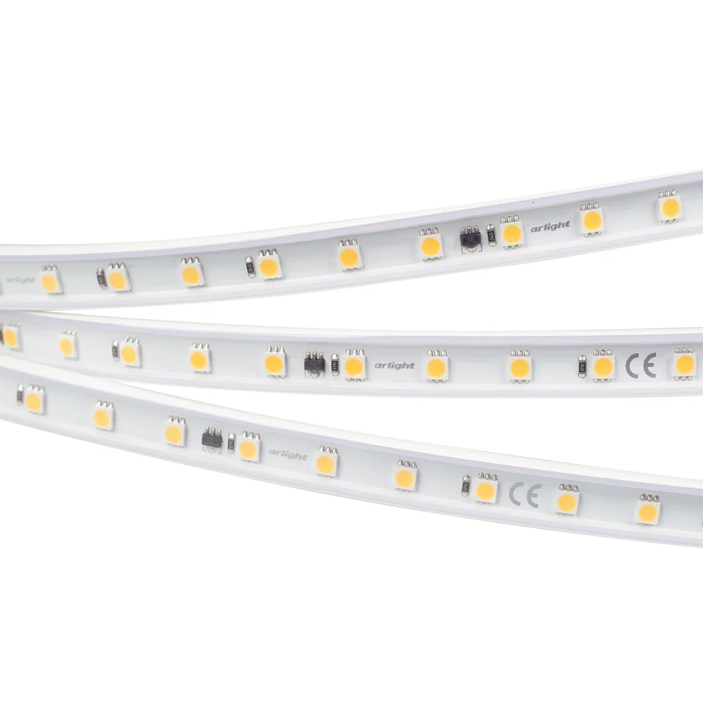 Светодиодная герметичная лента ARL серии B54, IP65 (PV — трубка, ПВХ экструзия). Светодиоды 5060, 54 шт/м, белая плата шириной 12 мм. Цвет ТЕПЛЫЙ 2700K, индекс цветопередачи CRI>90, угол 120°. Питание 230 В, мощность 8 Вт/м (80 Вт на 10 м). Размеры 50000×15.5×6 мм. Мин. отрезок 500 мм, 27 светодиодов. Цена за 1 м. Светодиодная лента […]