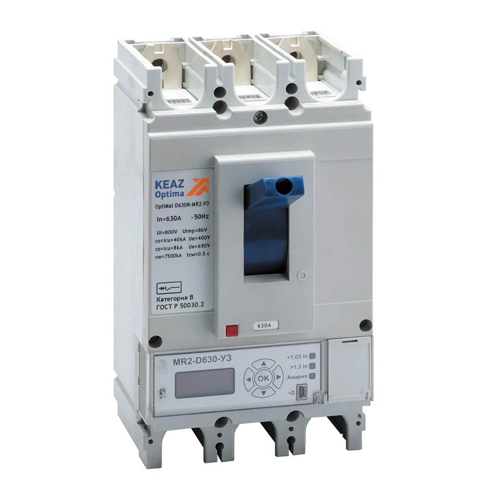 Блочный автоматический 3 полюсный выключатель переменного тока с предельной коммутационной способностью при переменном токе 40 кА на номинальный ток 630 А с приемкой Морского регистра.