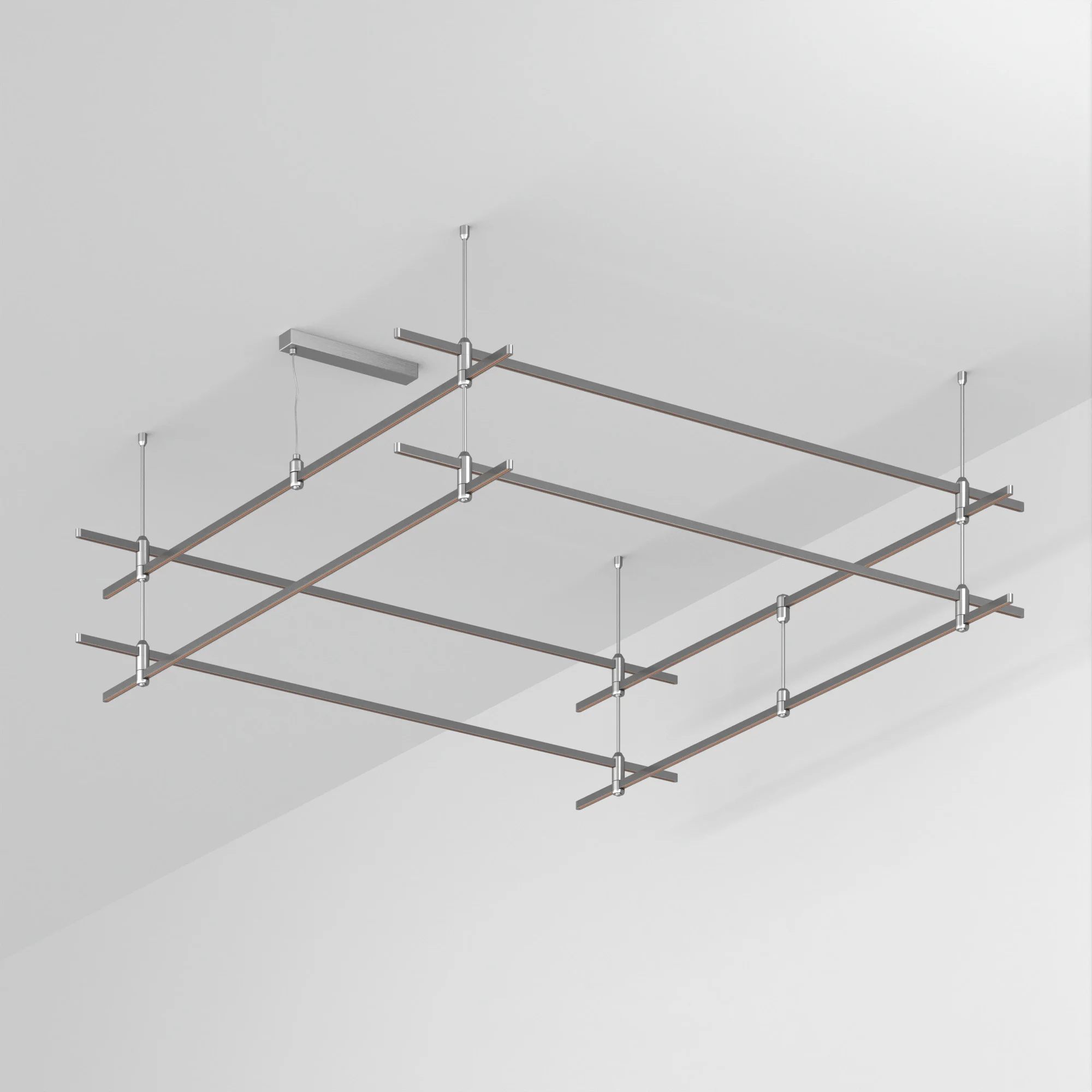 Подвесная конструкция APRIORI, форма параллелепипед. В комплекте треки с аксессуарами и жесткими подвесами длиной 400 мм. DC48V. Материал алюминий, цвет титан. Размер ДxШxВ: 2000x2000x300мм. Светильники и источники питания приобретаются отдельно.