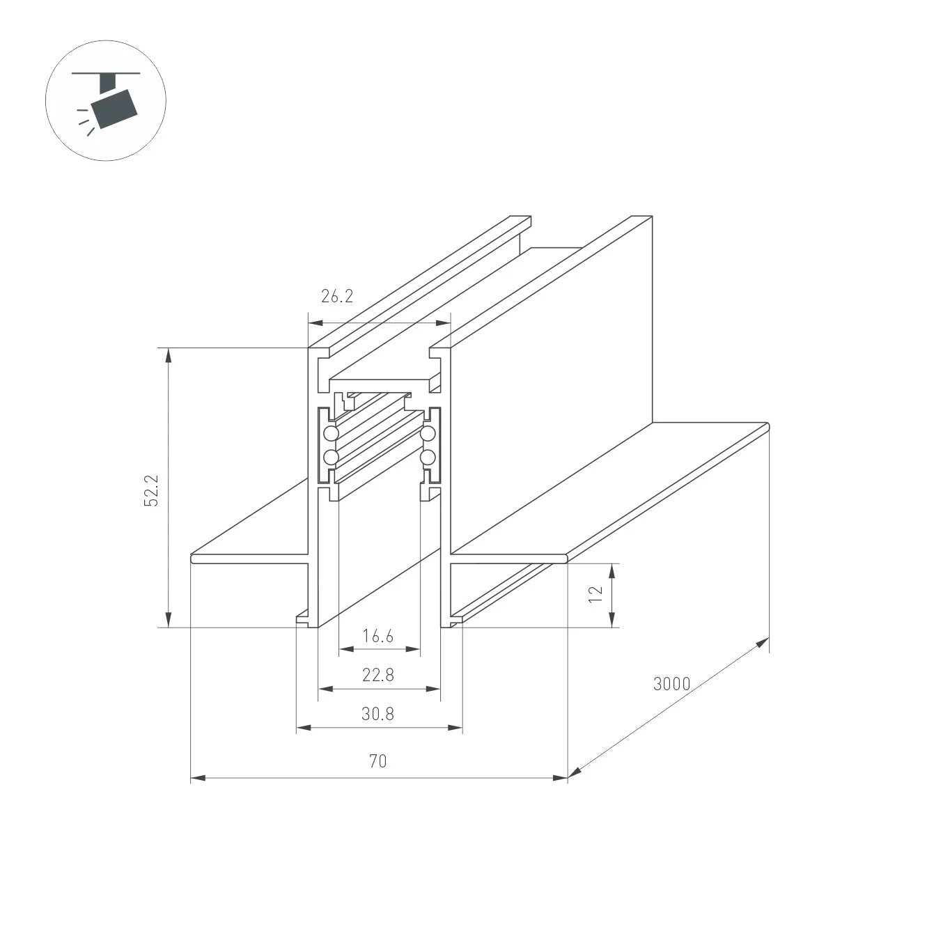 Встраиваемый магнитный трек ORIENT с фланцем и плоскими токоведущими дорожками, длина 3000 мм. DC48V. Материал алюминий, цвет черный. Заглушки в комплект не входят. Размер ДxШxВ: 3000×26.3×52.7мм. Размер (с учетом заглушек и фланцев) ДxШxВ: 3005x70x52.7мм. Подходит под ГКЛ 12.5 мм.