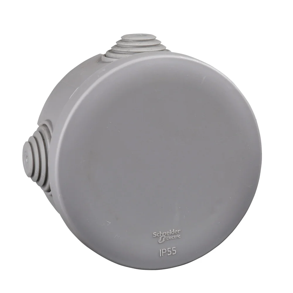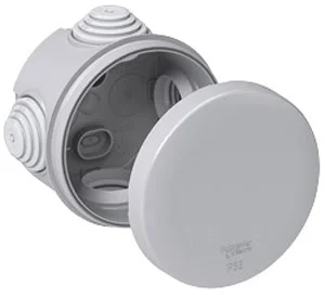 КОРОБКА РАСПРЕДЕЛИТЕЛЬНАЯ ОТКРЫТОЙ УСТАНОВКИ, внутренние размеры 80X40 мм, габариты D100х48 мм, степень пылевлагозащиты IP55, 4 сальника, цвет-серый
