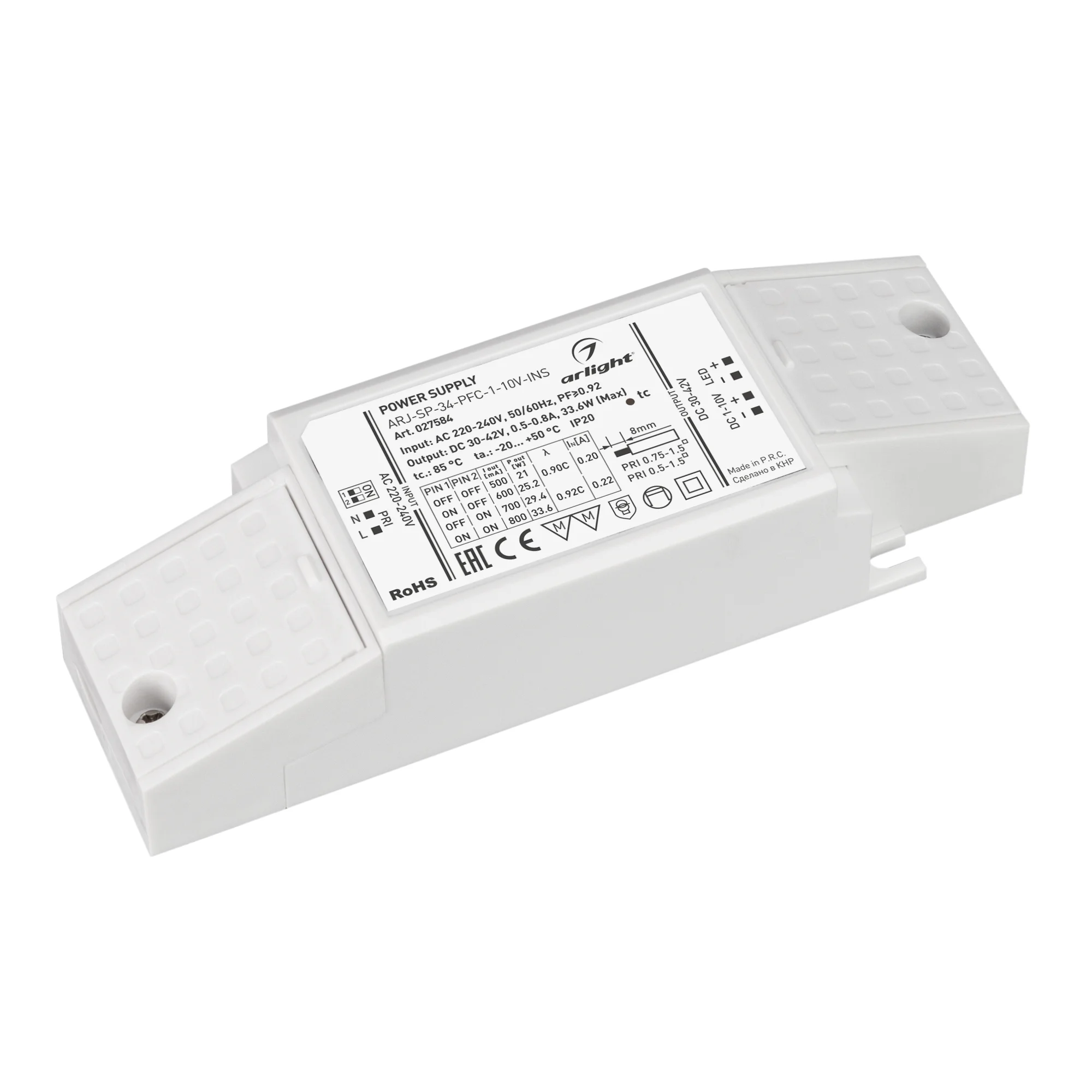 Диммируемый мультитоковый блок питания с управлением 1-10V с гальванической развязкой. Входное напряжение 220-240VAC. Выходные параметры: 30-42В (500/600/700/800мA), максимальная мощность 33,6 Вт. Выбор значения тока осуществляется DIP-переключателем. Встроенный PFC >0,92. Негерметичный пластиковый корпус IP20. Габаритные размеры длина 138 мм, ширина 44 мм, высота 30 мм (98x44x30 мм — без бок. крышек). Гарантия 5 лет.