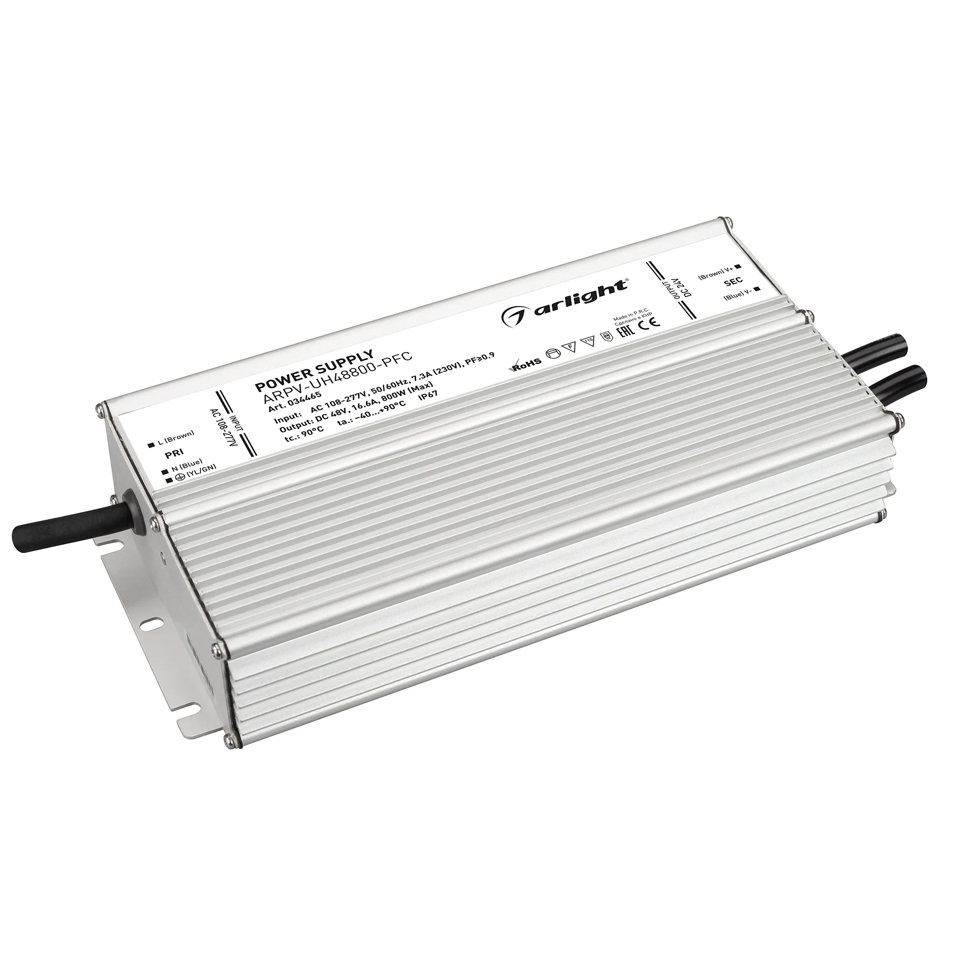 Источник напряжения с гальванической развязкой для светодиодных изделий. Входное напряжение 108-277 VAC. Выходные параметры: 48 В, 16.6 А, 800 Вт. Встроенный PFC >0,9. Герметичный алюминиевый корпус IP 67. Рабочая температура -40…+70C°. Габаритные размеры длина 262 мм, ширина 125 мм, высота 49 мм. Гарантийный срок 7 лет.