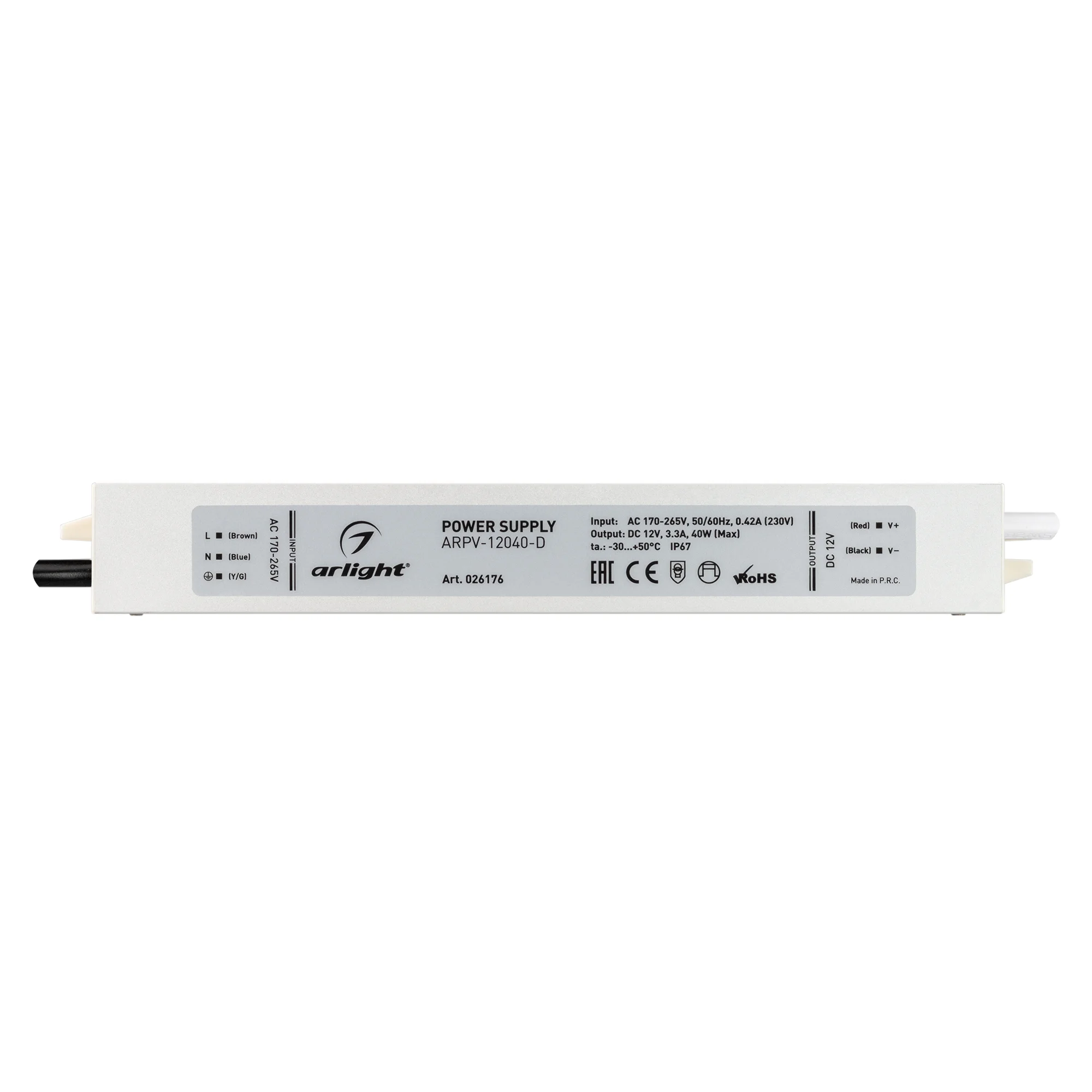 Источник напряжения с гальванической развязкой для светодиодных изделий. Входное напряжение 170-265 VAC. Выходные параметры: 12 В, 3,3 А, 40 Вт. Встроенный PFC >0,5. Герметичный алюминиевый корпус IP 67. Рабочая температура -30…+50C°. Габаритные размеры длина 217 мм, ширина 30 мм, высота 20 мм. Гарантийный срок 3 года.