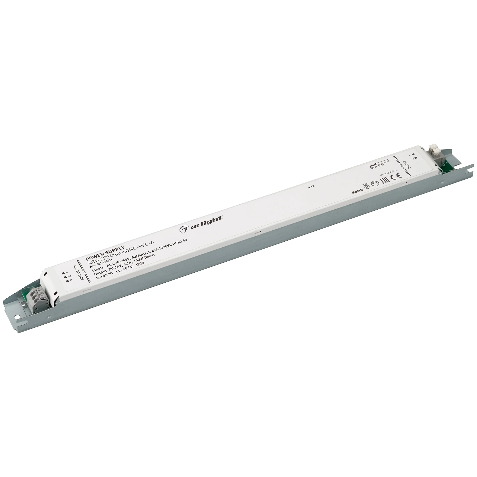 Источник напряжения с гальванической развязкой для светодиодных изделий. Входное напряжение 200-240 VAC. Выходные параметры: 24 В, 4.2 А, 100 Вт. Встроенный PFC >0.98. Герметичный алюминиевый корпус IP 67. Рабочая температура -30…+50C°. Габаритные размеры длина 303 мм, ширина 40 мм, высота 22 мм. Гарантийный срок 5 лет.