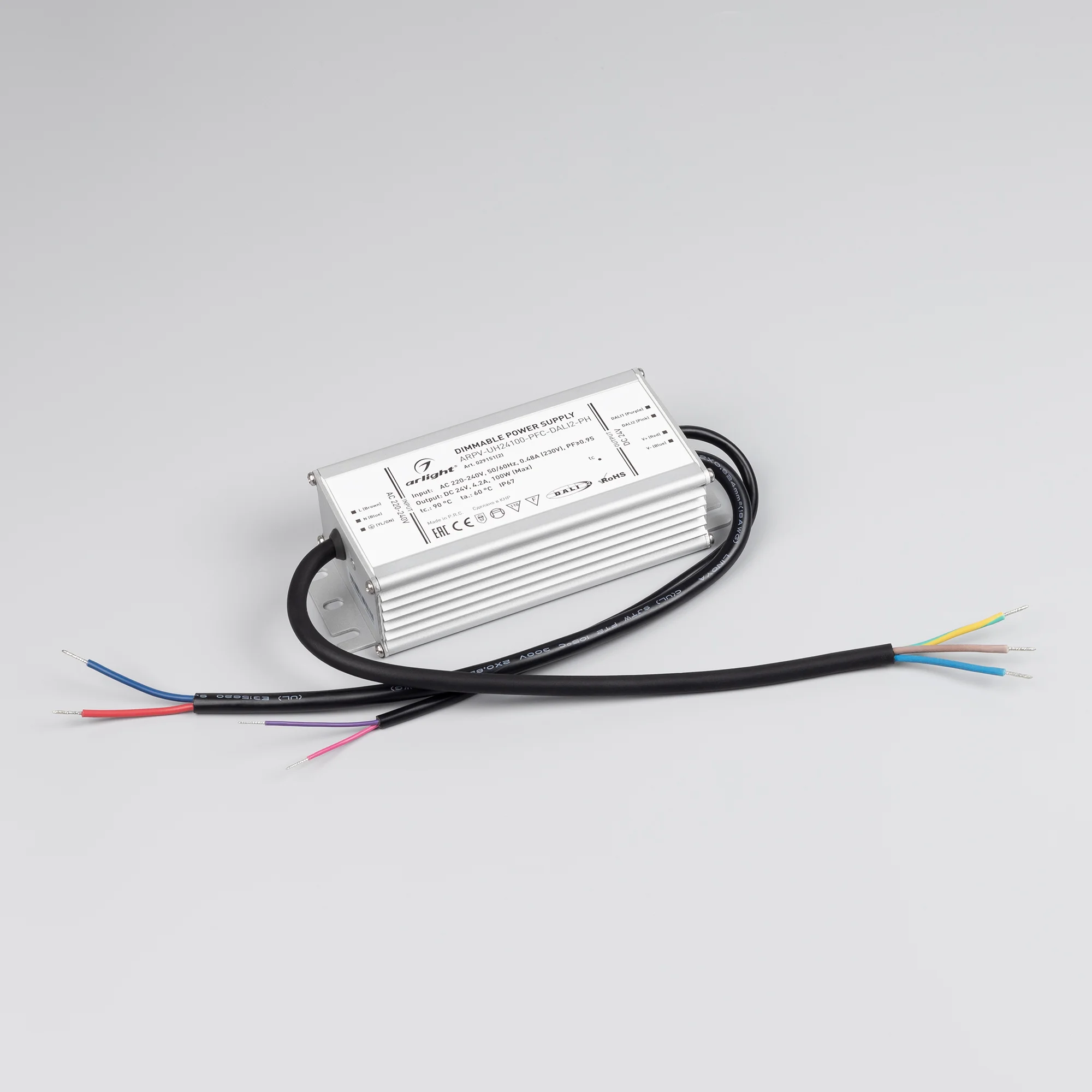 Диммируемый источник напряжения по протоколу DALI2.0 с гальванической развязкой для светодиодных изделий. Входное напряжение 220-240 VAC. Выходные параметры: 24 В, 4.2 А, 100 Вт. Встроенный PFC >0.95. Герметичный алюминиевый корпус IP 67. Рабочая температура -40…+70C°. Габаритные размеры длина 158 мм, ширина 67.5 мм, высота 38.5 мм. Гарантийный срок 7 лет.
