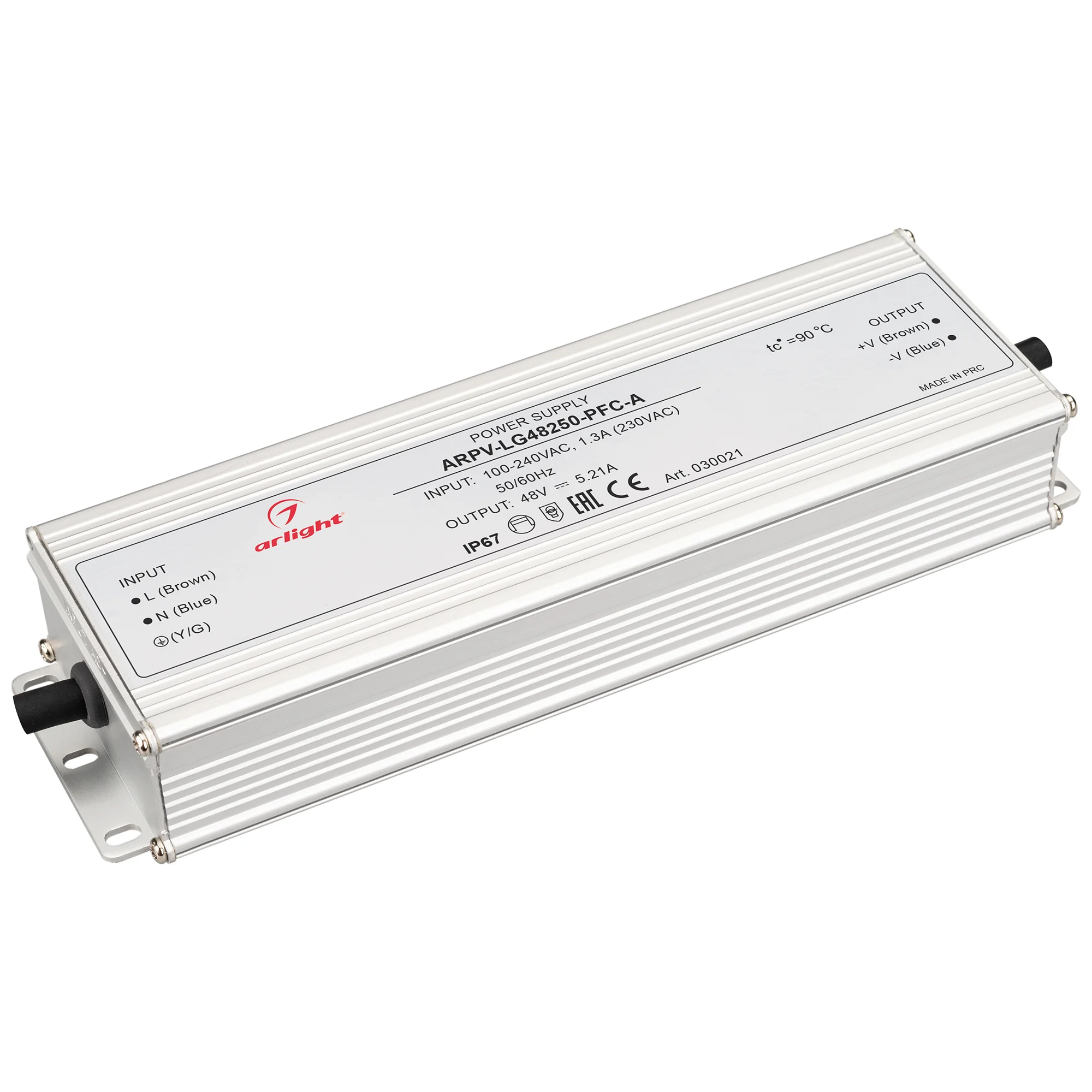 Источник напряжения с гальванической развязкой для светодиодных изделий. Входное напряжение 100-240 VAC. Выходные параметры: 48 В, 5.21 А, 250 Вт. Встроенный PFC >0.9. Герметичный алюминиевый корпус IP 67. Рабочая температура -40…+70C°. Габаритные размеры длина 219 мм, ширина 67.5 мм, высота 35.5 мм. Гарантийный срок 5 лет.