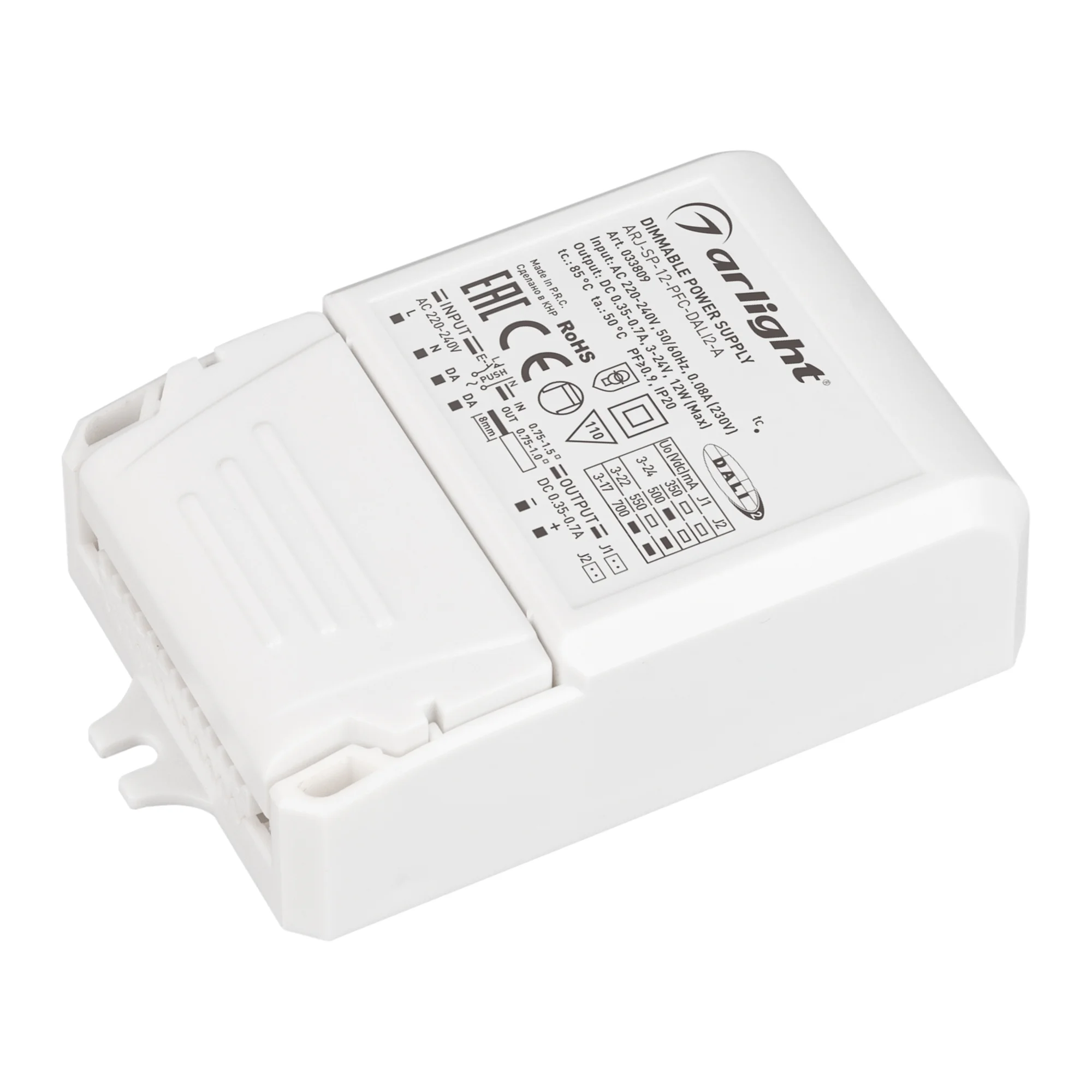 Диммируемый токовый блок питания с управлением DALI 2.0 и функцией Push Dim с гальванической развязкой. Входное напряжение 220-240VAC. Выходные параметры 3-24В (350/500мA), 3-22В (550мA), 3-17В (700мA), максимальная мощность 12Вт. Встроенный PFC >0,92. Габаритные размеры длина 88 мм, ширина 52 мм, высота 25.5 мм. Гарантийный срок 5 лет.