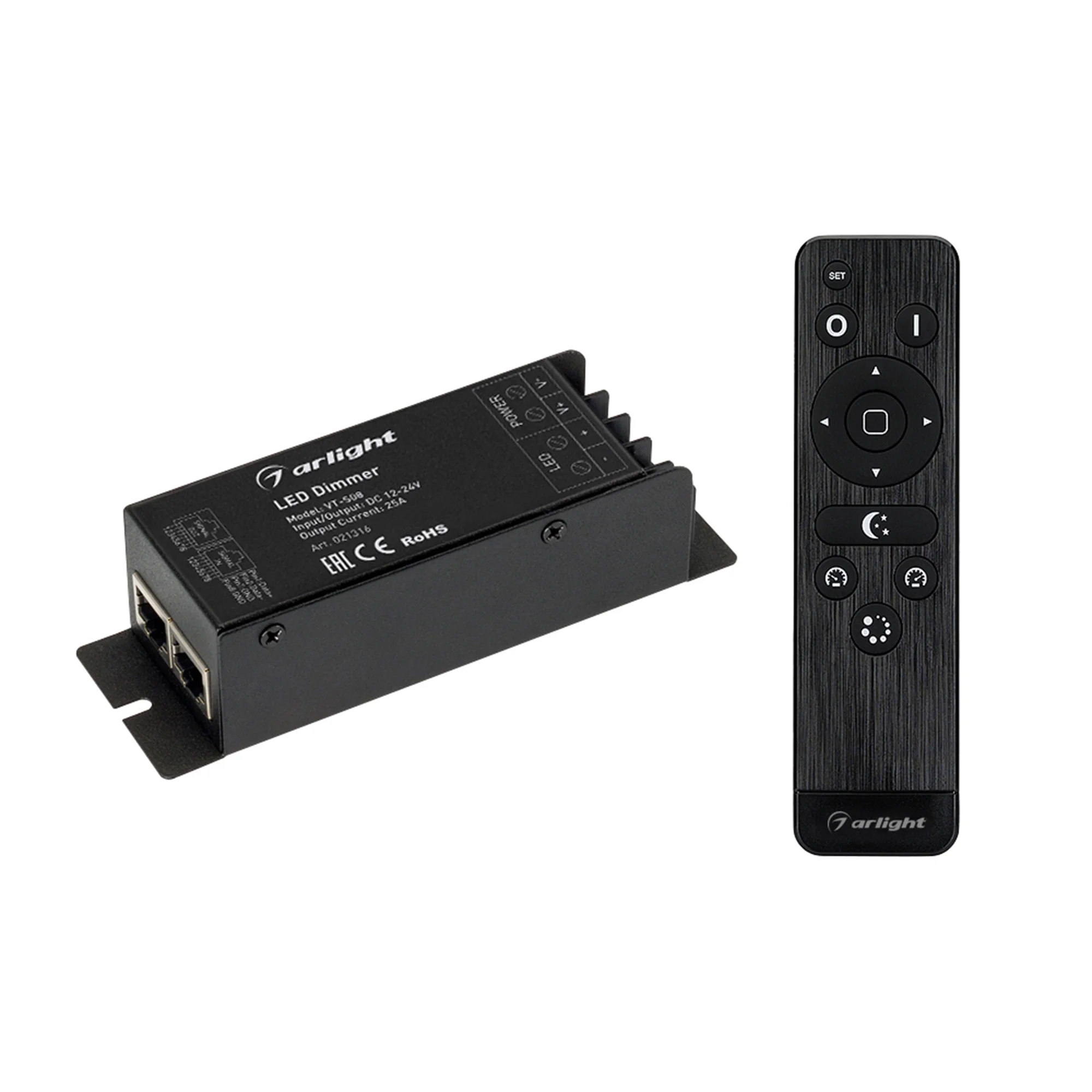 Диммер (овальный черный радиопульт с 5 кнопками и сенсорным кольцом). Управление яркостью с помощью сенсор. кольца, 12-24V, 300-600W, 25A/канал, 1 канал. Габариты диммера 127x41x32 мм, габариты пульта 114х56х23 мм.