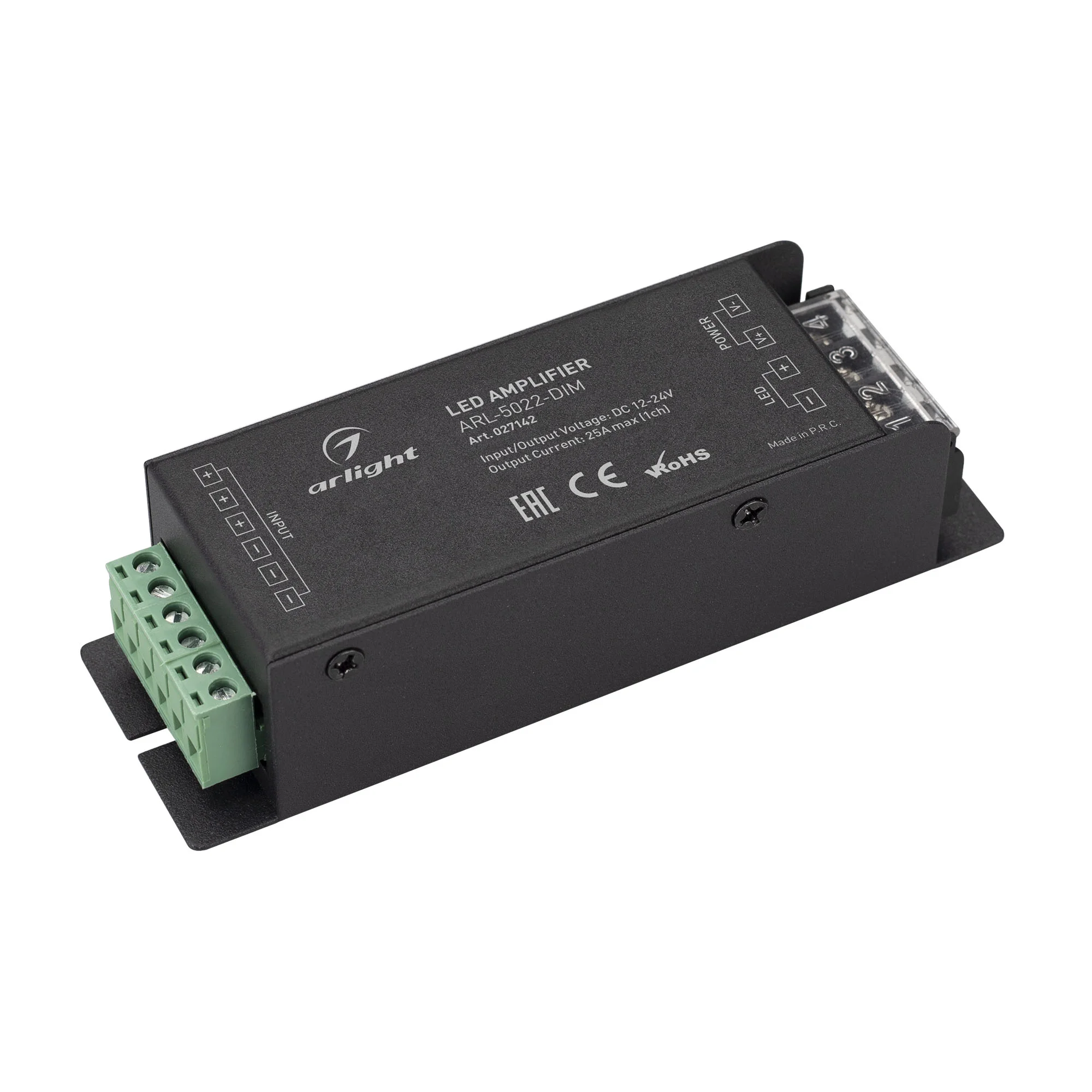 Одноканальный DIM усилитель для диммеров (12-24VDC). Питание 12-24VDC. 1 канал, ток нагрузки 1x25A, мощность нагрузки 300-600W. Размер 127х41х32 мм.