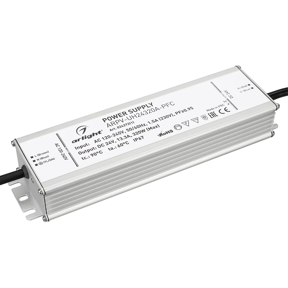 Источник напряжения с гальванической развязкой для светодиодных изделий. Входное напряжение 220-240 VAC. Выходные параметры: 24 В, 13.3 А, 320 Вт. Встроенный PFC >0.95. Негерметичный пластиковый корпус IP 20. Габаритные размеры длина 215 мм, ширина 77 мм, высота 35 мм. Гарантийный срок 5 лет.