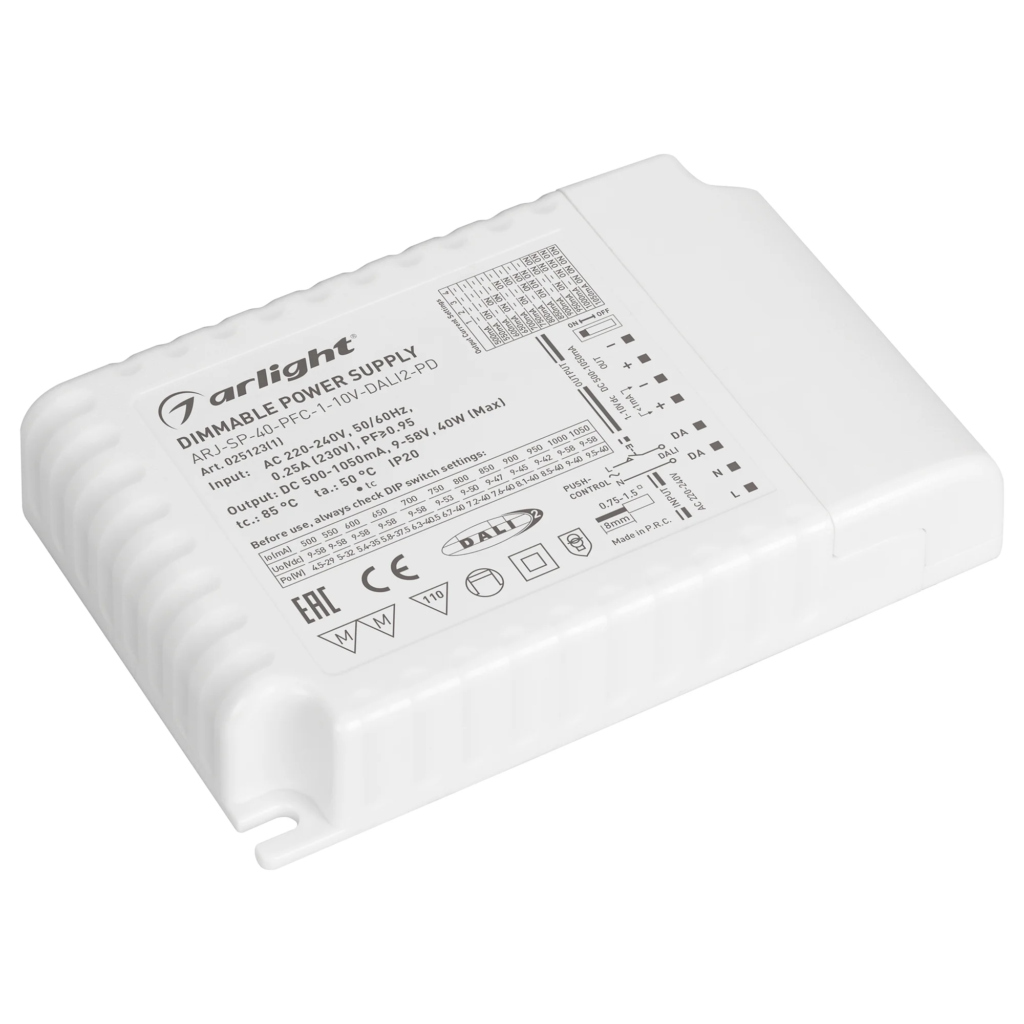Диммируемый источник тока по протоколу DALI 2.0 (диапазон 0.1-100%) с гальванической развязкой для светильников и мощных светодиодов. Входное напряжение 100-240 VAC. Выходные параметры: 9-48В (500/550/600/650/700/750/800мА), 9-47В (850мA), максимальная мощность 40 Вт. Встроенный PFC >0.97. Негерметичный пластиковый корпус IP 20. Габаритные размеры длина 122 мм, ширина 44 мм, высота 27 мм. Гарантийный срок 3 года.