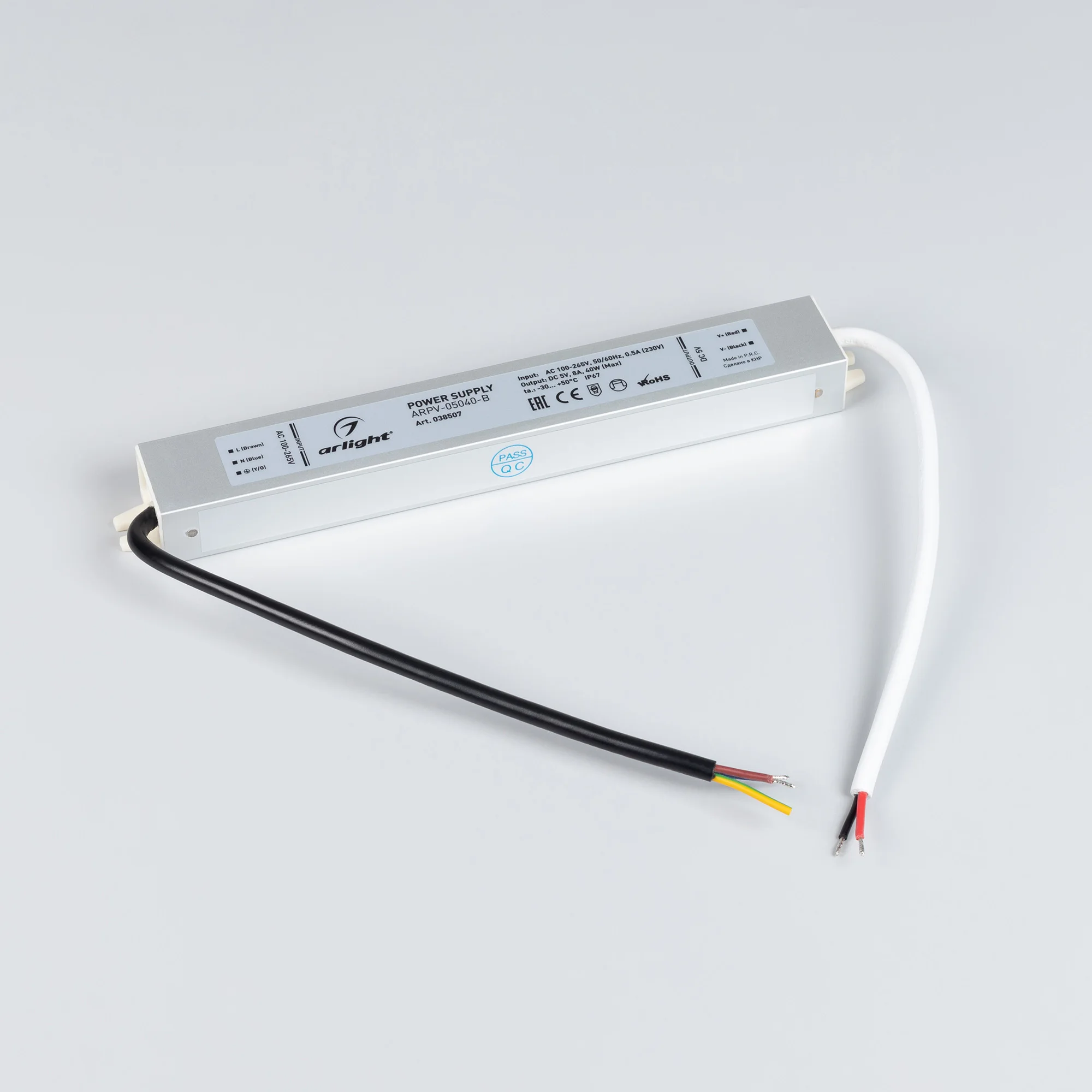 Источник напряжения с гальванической развязкой для светодиодных изделий. Входное напряжение 100-240 VAC. Выходные параметры: 5 В, 8 А, 40 Вт. Герметичный пластиковый корпус IP 67. Рабочая температура -30…+50C°. Габаритные размеры длина 223 мм, ширина 30 мм, высота 20 мм. Гарантийный срок 3 года.