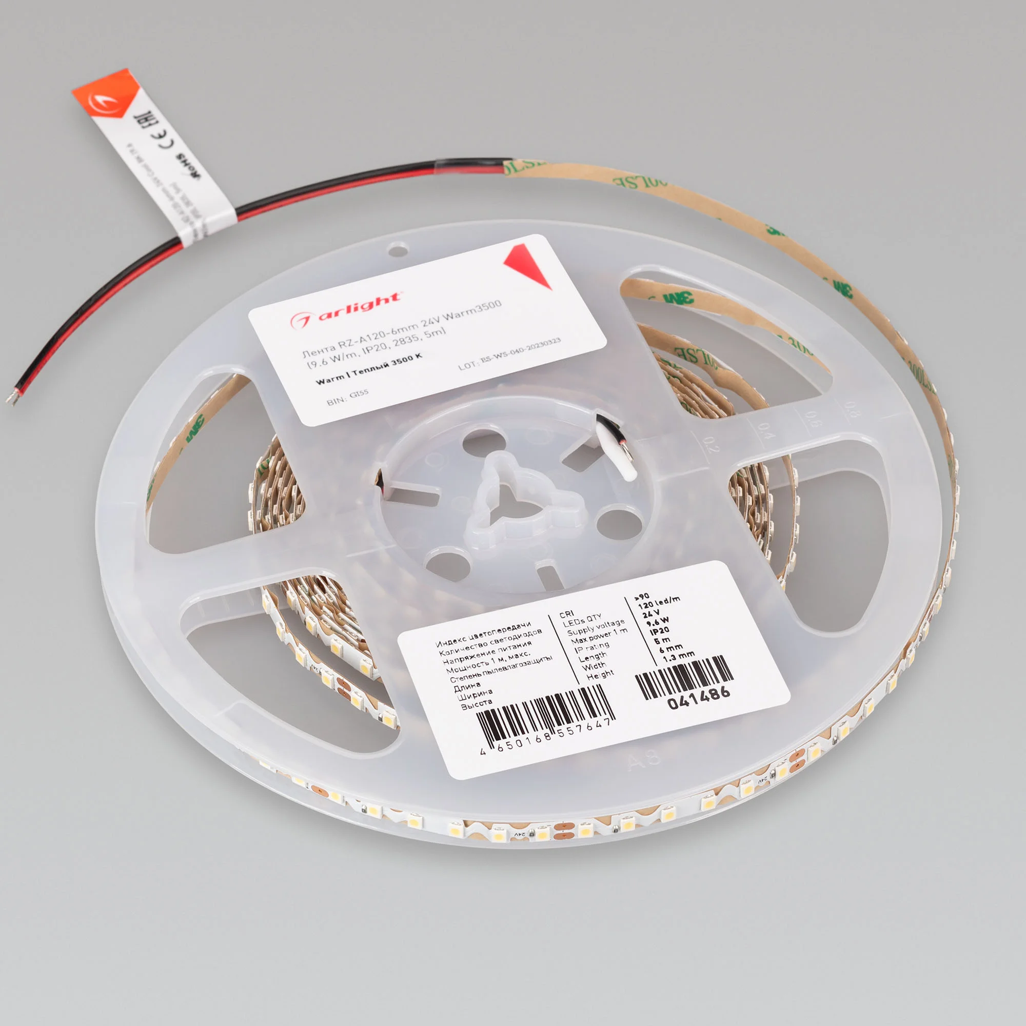 Гибкая светодиодная лента RZ серии A120 с фигурной платой в форме волны, легко изгибается на плоскости. Светодиоды SMD 2835, 120 шт/м, белая плата шириной 6 мм, скотч 3М. Цвет ТЕПЛЫЙ 3500K, индекс цветопередачи CRI>90, угол 120°. Питание 24 В, мощность 9.6 Вт/м (48 Вт на 5 м). Размеры 5000х6х1.3 мм. Мин. отрезок 50 мм, 6 […]