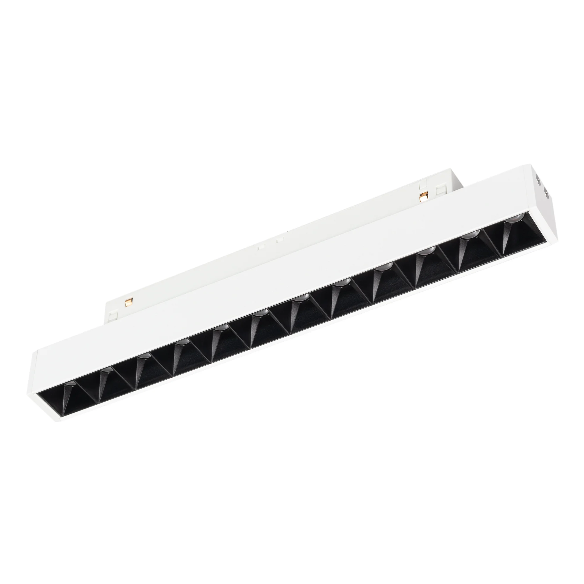 Светильник для магнитных треков MAG-ORIENT шириной 26 мм. Мощность 16 Вт, св. поток 720 лм, 45 лм/Вт, теплый 2700 K, CRI>90, угол 24°, напряжение питания 48 В. Белый прямоугольный корпус из металл, экран поликарбонат, степень защиты IP20. Размер: длина 462 мм, ширина 22 мм, высота 42 мм. Монтаж на трек MAG-ORIENT. Пульсация <1%.