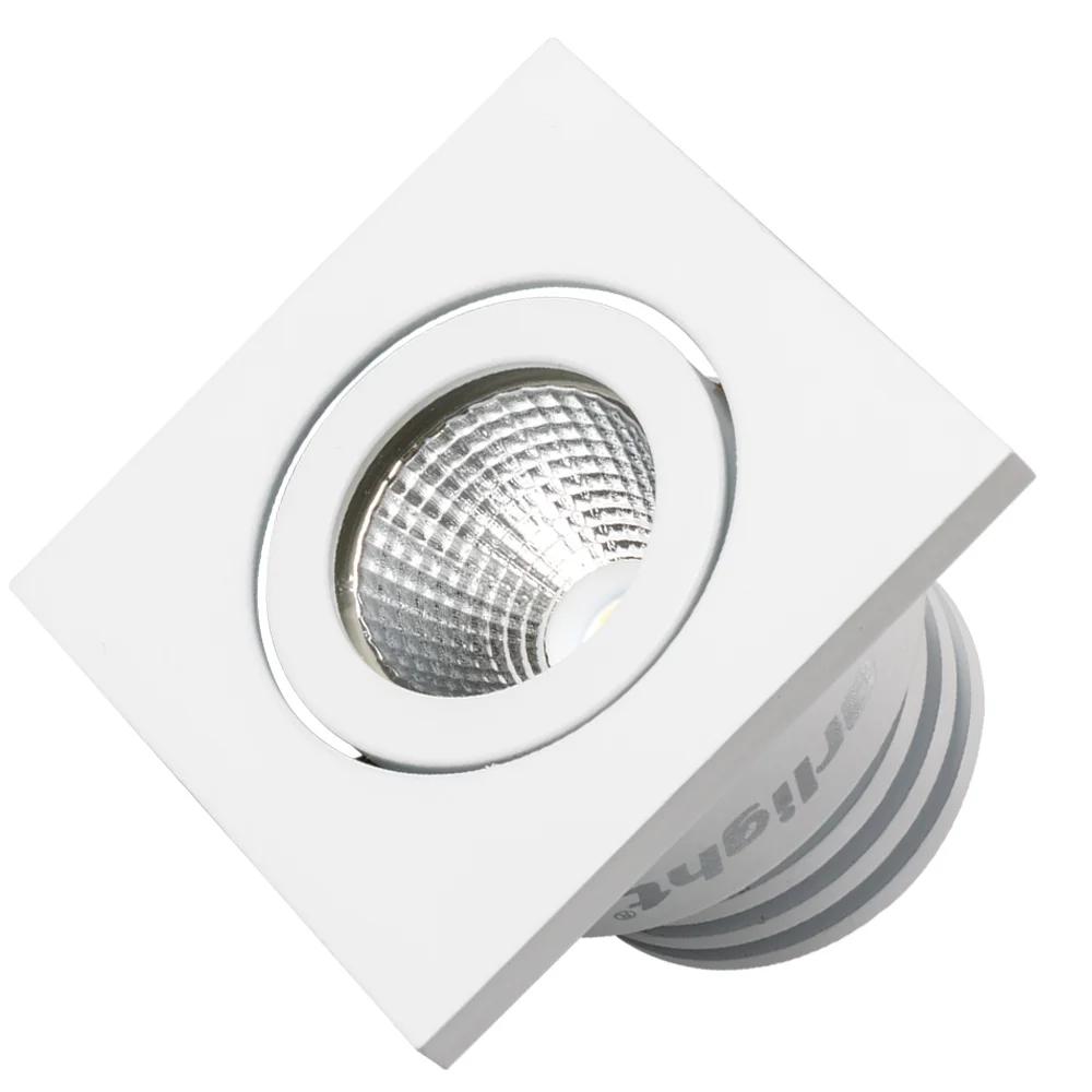 Врезной квадратный мебельный светильник 5Вт, корпус белый алюминий. Цвет ДНЕВНОЙ БЕЛЫЙ 4000K. Светодиод 1х5W Bridgelux. CRI>80, Св.поток 350-400лм, наклоняемая ось, угол 25°. Питание 180-240VAC, 5Вт, 400mA 11-13V, драйвер в комплекте. Размеры 50x50x50 мм, врезное отверстие d42 мм.
