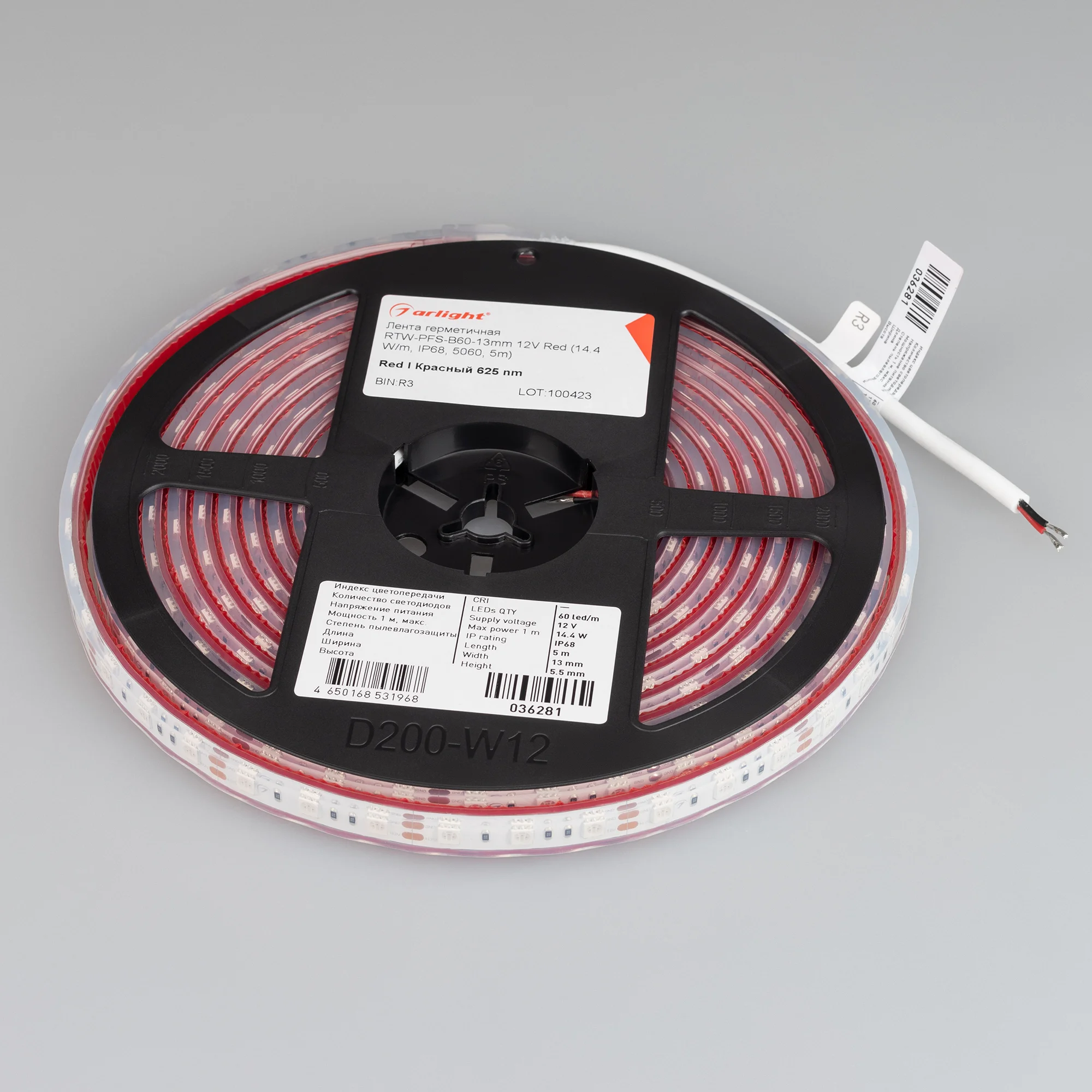 Светодиодная герметичная лента RTW серии B60, IP68 (PFS — полная силиконовая экструзия). Светодиоды 5060, 60 шт/м, белая плата шириной 10 мм, скотч 3M. Цвет КРАСНЫЙ 625 нм, угол 120°. Питание 12 В, мощность 14.4 Вт/м (72 Вт на 5 м). Размеры 5000x13x5.5 мм. Мин. отрезок 50 мм, 3 светодиода. Цена за 1 м. Кратность заказа […]