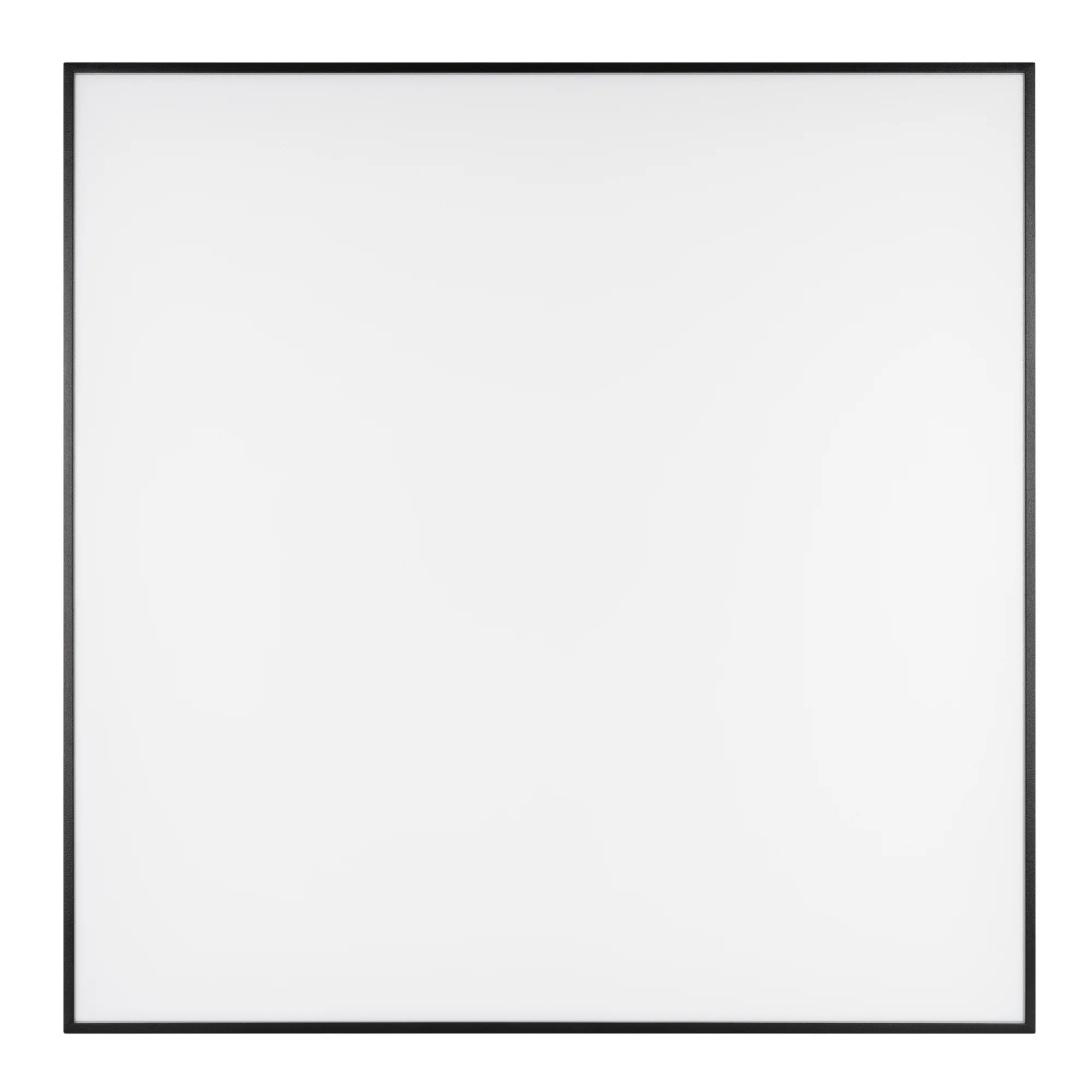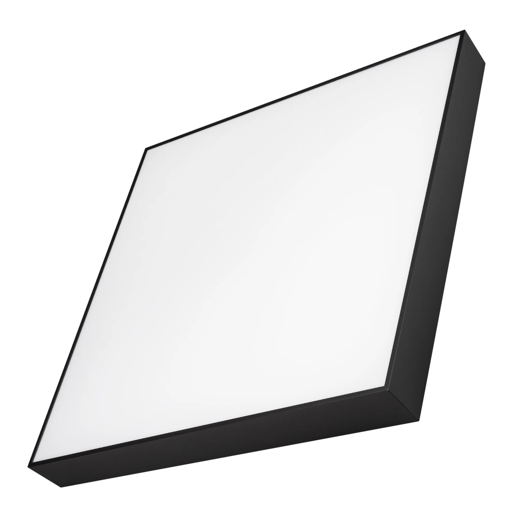 Накладной светильник. Мощность 60 Вт, св. поток 4900-5500 лм, 80-90 лм/Вт, дневной 4000 K, CRI>90, угол 120°, напряжение питания 230 В. Черный квадратный корпус из алюминия, экран PC, степень защиты IP40. Размер: длина 600 мм, ширина 600 мм, высота 64 мм. Монтаж накладной. Драйвер 27-40 В, 1400 мА, пульсация <5%.