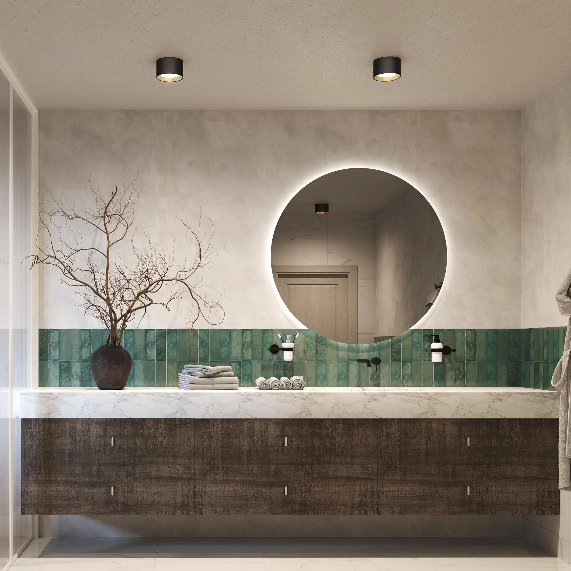 Накладной светильник. Мощность 15 Вт, св. поток 1100-1160 лм, 80-85 лм/Вт, теплый 2700 K, теплый 3300K, дневной 4000K (переключается), CRI>90, угол 80°, напряжение питания 230 В. Черный круглый корпус из алюминия с золотой вставкой, экран PC, степень защиты IP54. Размер: диаметр 140 мм, высота 85 мм. Монтаж накладной. Драйвер 26-42 В, 350 мА, пульсация <2%.