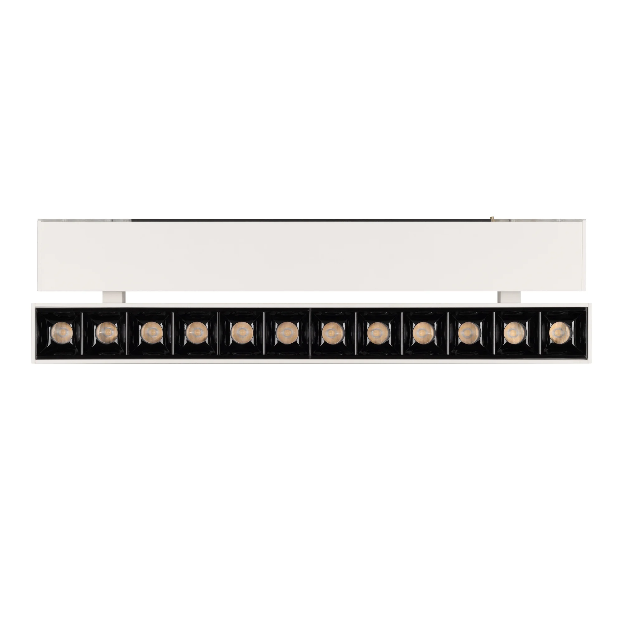 Светильник поворотный для магнитных треков шириной 45мм, 12Вт. Цвет свечения ТЕПЛЫЙ 3000K, световой поток 1200лм, угол 100°, CRI>90. Корпус прямоугольный, металл, цвет белый, IP20. Размеры LxWxH 404x35x92.5мм. Входное напряжение DC24V, мощность 12Вт. Драйвер DС24V/AC230V поставляется отдельно. Не диммируется.