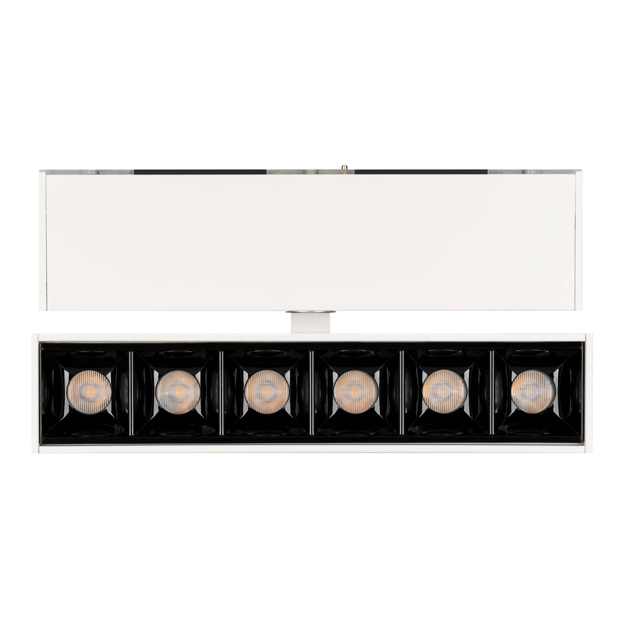 Светильник поворотный для магнитных треков шириной 45мм, 6Вт. Цвет свечения ДНЕВНОЙ 4000K, световой поток 455лм, угол 15°, CRI>90. Корпус прямоугольный, металл, цвет белый, IP20. Размеры LxWxH 163x35x92.5мм. Входное напряжение DC24V, мощность 6Вт. Драйвер DС24V/AC230V поставляется отдельно. Диммируется только с 026407(1), 027633.