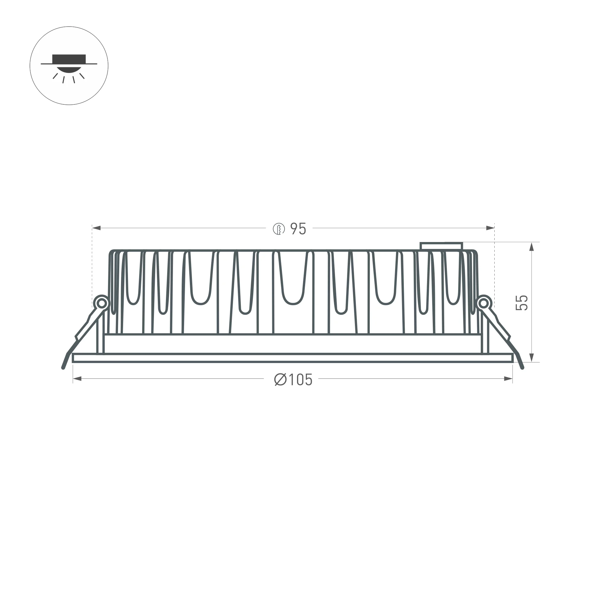 Встраиваемый светильник даунлайт. Мощность 12 Вт, св. поток 670 лм, 56 лм/Вт, дневной 4000 K, CRI>90, угол 85°, напряжение питания 230 В. Чёрный круглый корпус из алюминия, степень защиты IP20. Размер: диаметр 104 мм, высота 55 мм. Монтаж встраиваемый, установочное отверстие: диаметр 95 мм. Драйвер 27-42 В, 300 мА, пульсация <2%.