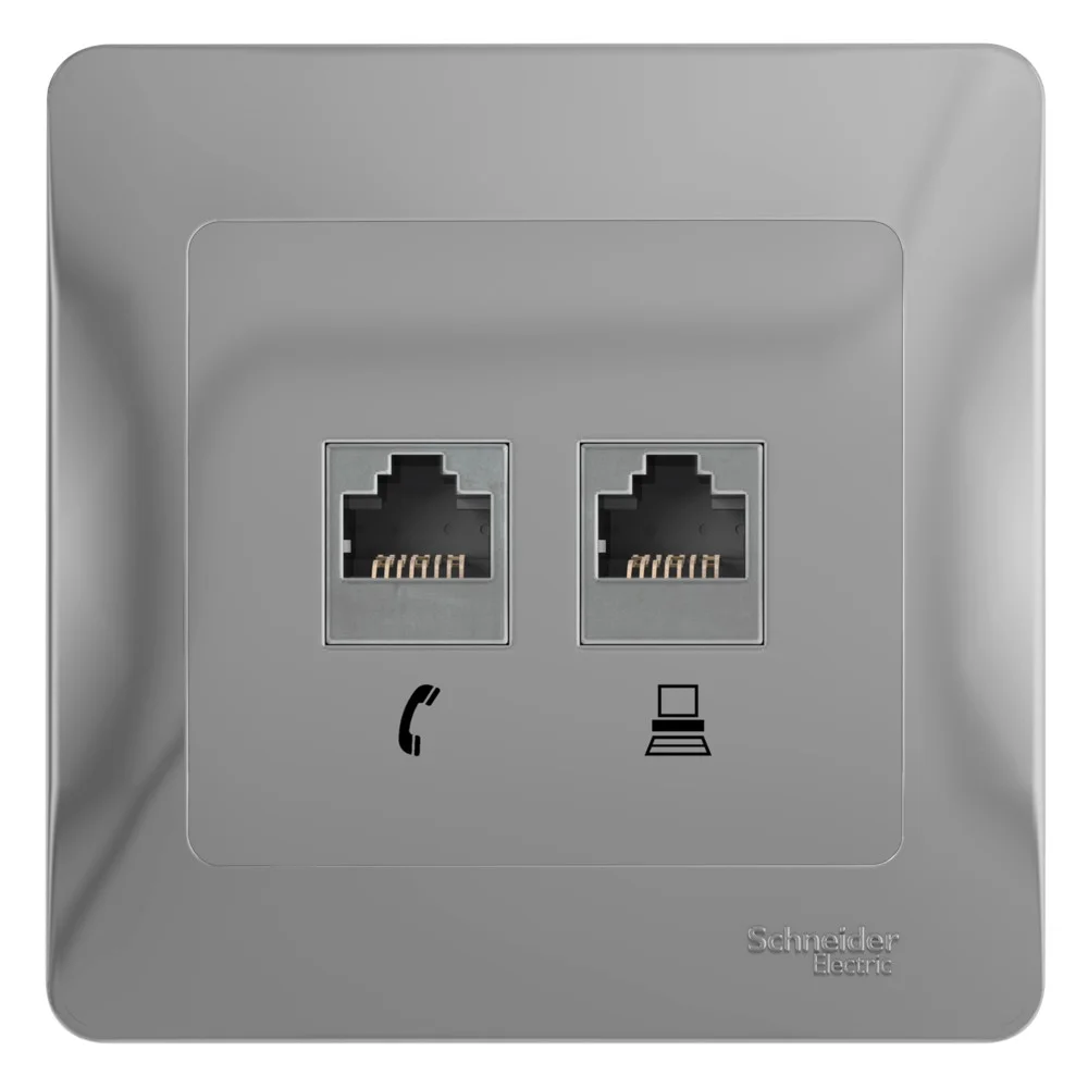 Механизм Systeme Electric (ранее Schneider Electric) серии Glossa (цвет алюминий) двойной розетки разъёмами RJ45 категория 5е и RJ11 предназначен для удобного и быстрого подключения вашего компьютера и телефона к соответствующим сетям. — Выполнен из материала PС+ASA, стойкого к УФ-излучению и появлению царапин.