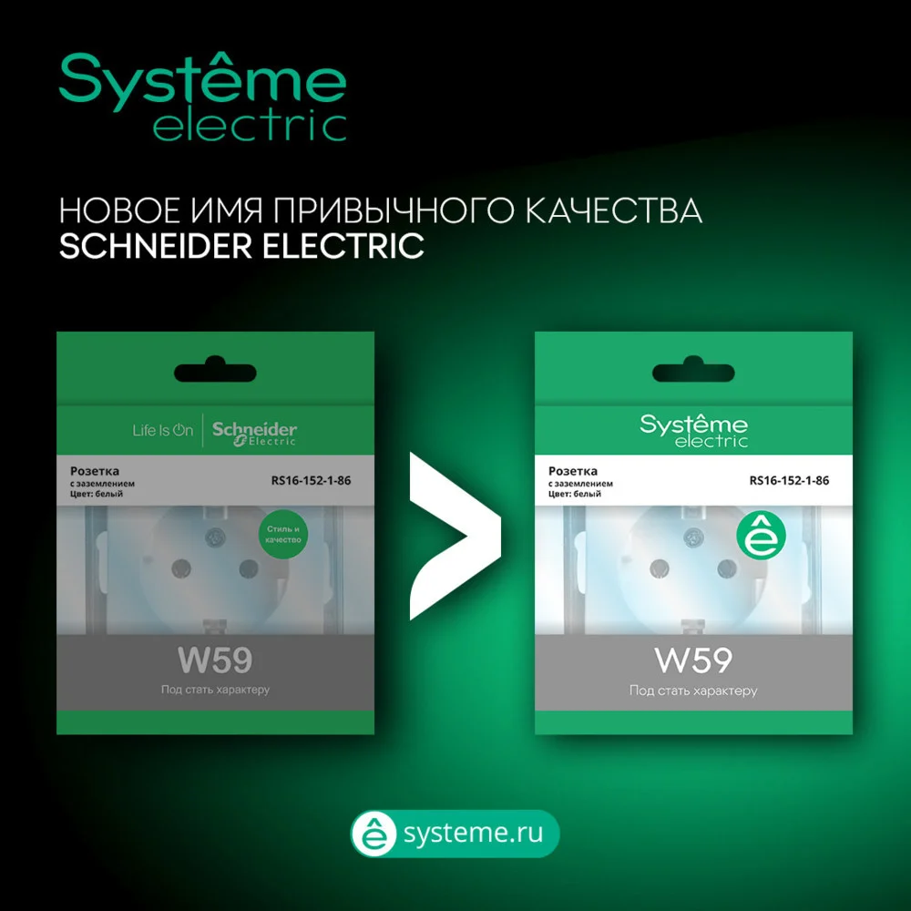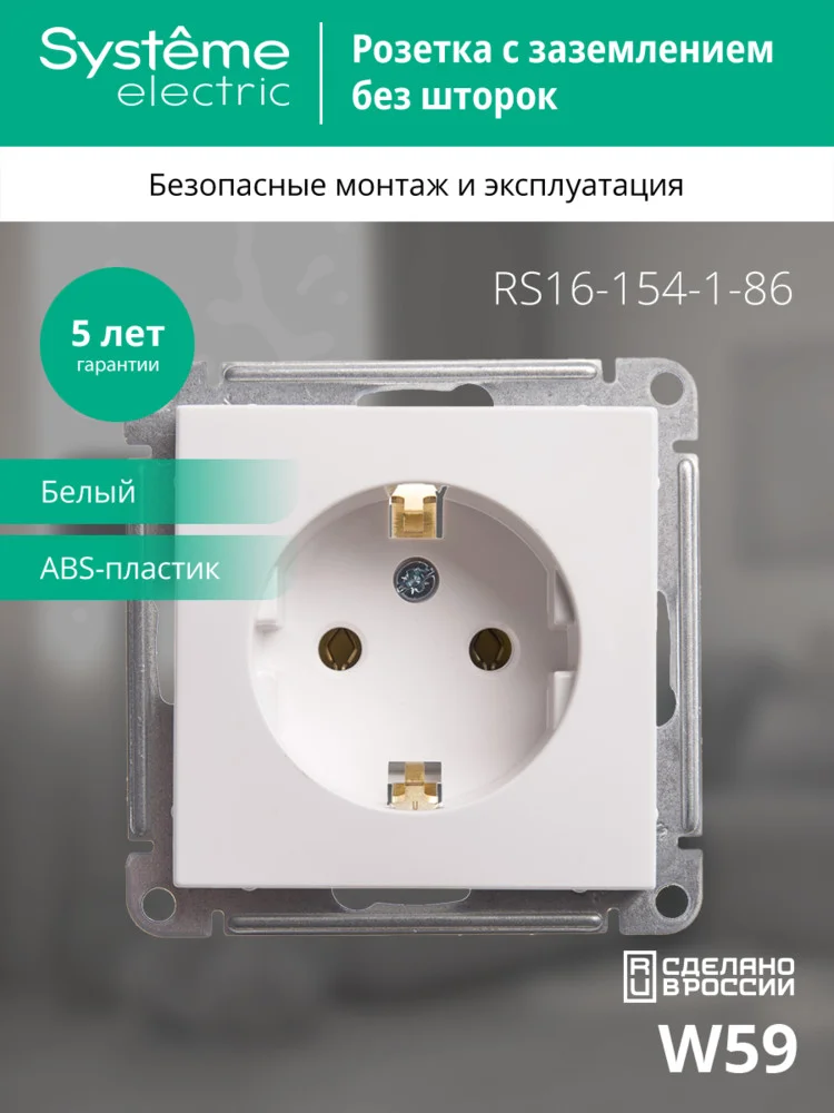 Механизм Systeme Electric (ранее Schneider Electric) W59 (цвет белый) розеткис заземлением без шторок подходит для сетей 250 В, на ток 16 А. — Заземляющий контакт обеспечивает дополнительную защиту от удара электрическим током. При наличии заземления электрический потенциал уходит в землю, защищая человека. — Корпус изделия выполнен из высококачественного ABS-пластика.