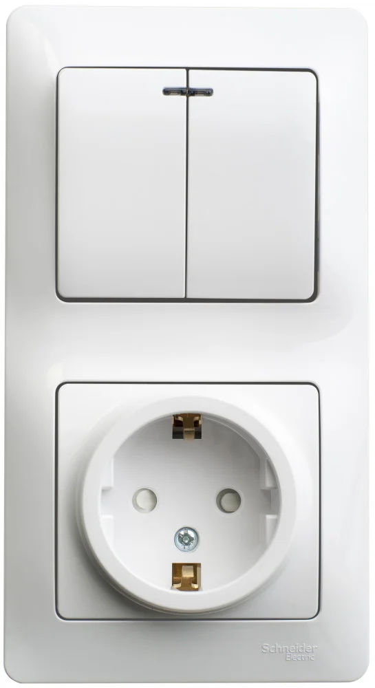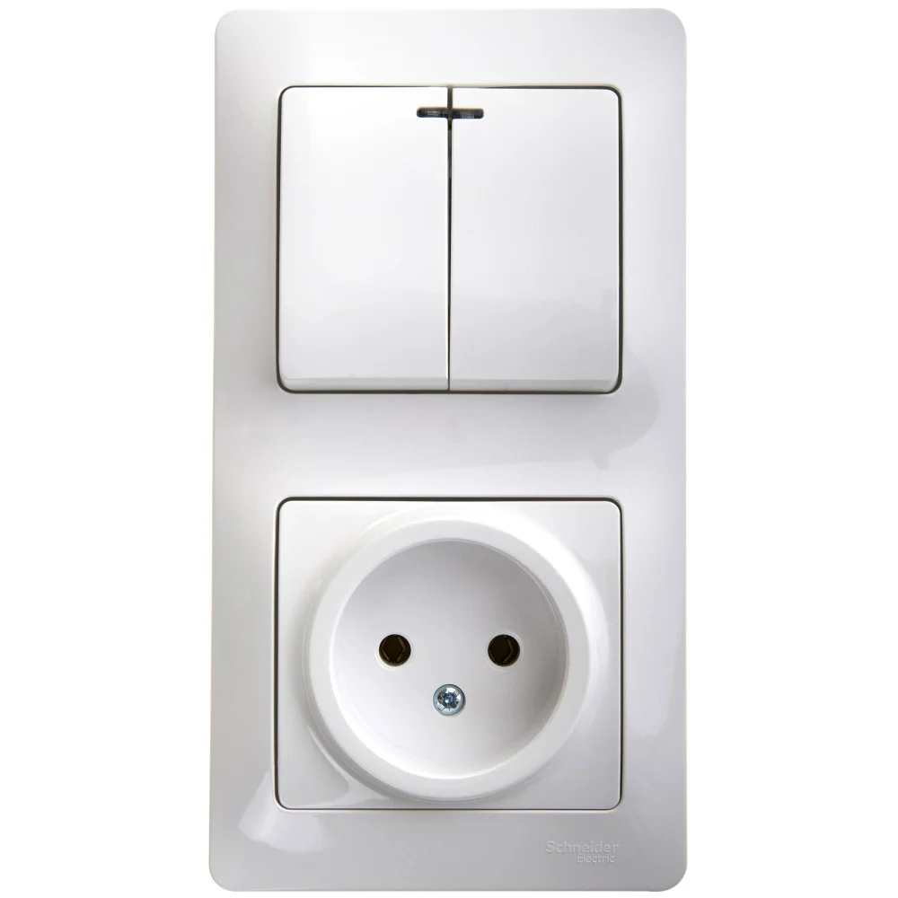 Блок Systeme Electric (ранее Schneider Electric) ЭТЮД (кремовый, открытой установки) предназначен для применения в сетях до 250В, состоит из розетки на 16А с заземлением и шторками и двухклавишного выключателя на 10А. Две клавиши позволяют управлять двумя источниками света с одной точки. Он удобен в применении и отлично подходит для коридора. Сделано в России.