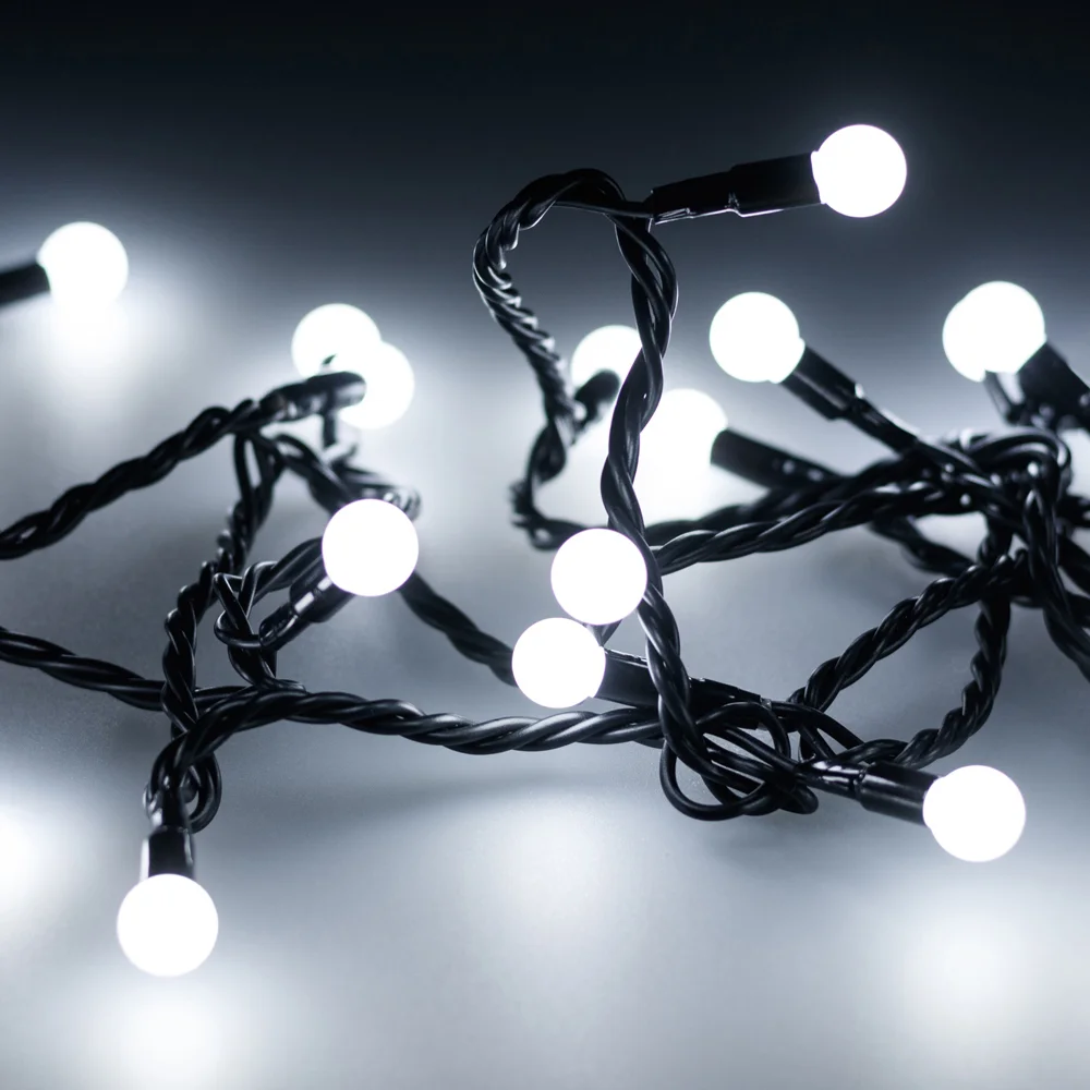 Светодиодные шарики Classic. Размер 10000 мм. Цвет свечения БЕЛЫЙ (6000 К), постоянное свечение. 100 шариков со светодиодом внутри размером 17.5 мм с мягким световым рисунком (выпуклая молочно-белая линза). Провод чёрный, ПВХ. Питание 230 В, Мощность 7 Вт, защита IP65, применение в помещении и на улице под навесом. Аксессуары для подключения приобретаются отдельно.