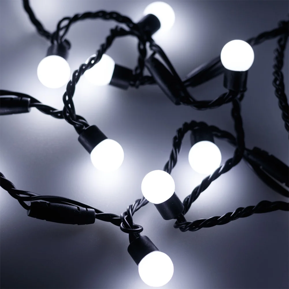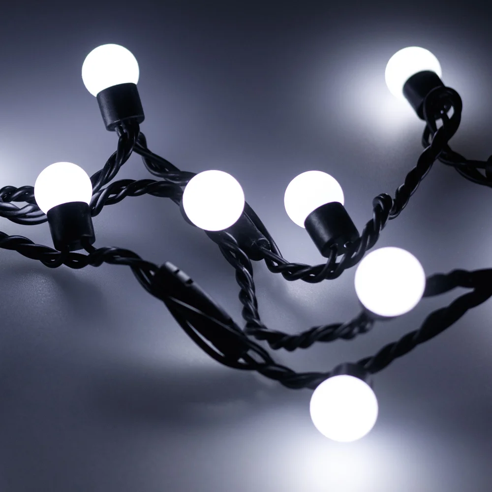 Светодиодные шарики Classic. Размер 10000 мм. Цвет свечения БЕЛЫЙ (6000 К), постоянное свечение. 100 шариков со светодиодом внутри размером 13 мм с мягким световым рисунком (выпуклая молочно-белая линза). Провод чёрный, ПВХ. Питание 230 В, Мощность 7 Вт, защита IP65, применение в помещении и на улице под навесом. Аксессуары для подключения приобретаются отдельно.