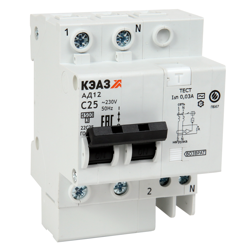 Автоматический выключатель дифференциального тока на номинальный ток 25 А и номинальный отключающий дифференциальный ток 10 мА.